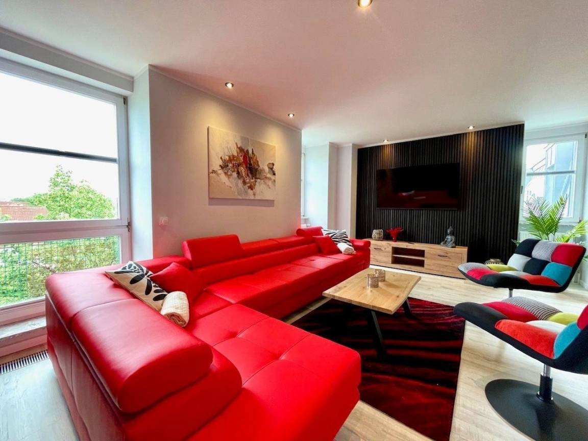 In dem offenen Wohnbereich, lädt eine große, rote Eckcouch, mit genügend Platz für alle Gäste, zum Verweilen und Entspannen ein.