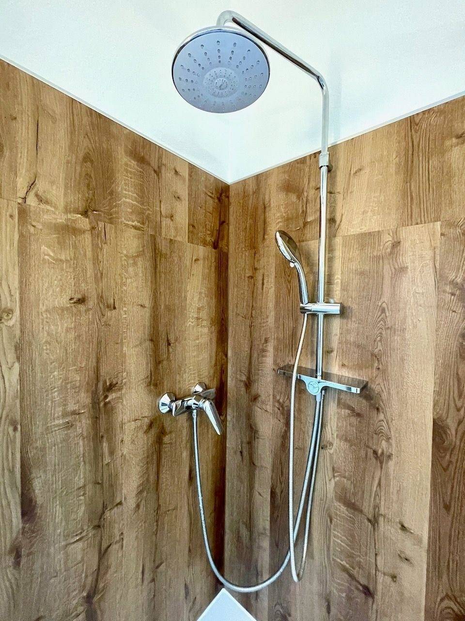 Wohn- und Essbereich mit einer Küchenzeile + einem Schlafsofa mit einem hochwertigen, integrierten Bett, Bad mit Dusche sowie einem Schlafzimmer mit Doppelbett.