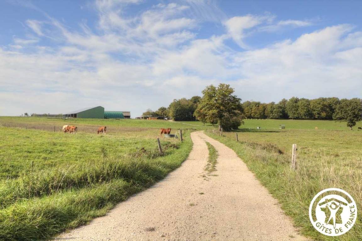 Eric und Anne Laure teilen sich ihre Arbeit als Biobauern. Wagen Sie einen kleinen Höflichkeitsbesuch bei Ihren Nachbarn, den Kühen und anderen Bewohnern des Hofes (Kälber, Label Hühnerstall).