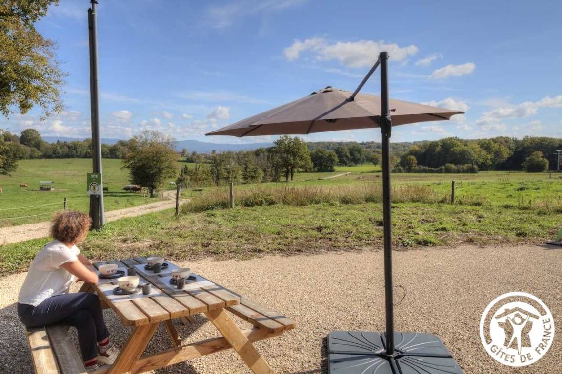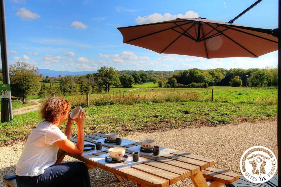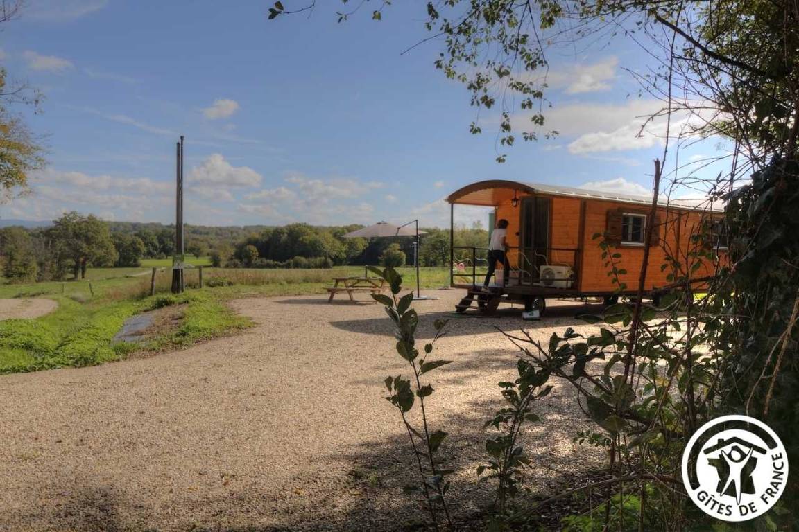 „Mon sejour a été très ressourçant et j'ai adoré le coin. La roulotte est confortable et bien équipée, les hôtes sont attentionnés et très sympathiques. Et quel plaisir de prendre son petit déjeuner avec une telle vue ! Beaucoup de jolies balades autour pour saluer vaches, chevaux et ânes. l'Ain est une belle découverte avec ses villages perchés sur les hauteurs, ses vignobles, ses plans d'eau et son magnifique monastère de Brou, une splendeur.“
