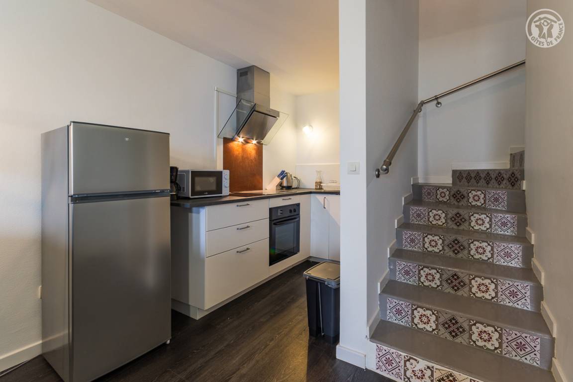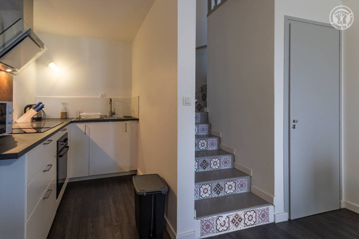 Ferienhaus in einem Haus, das an das des Eigentümers grenzt. Erdgeschoss (Zugang über wenige Stufen): Wohnküche mit Sitzecke, Abstellraum unter der Treppe. Obergeschoss: ein Schlafzimmer mit einem Doppelbett 140x190 cm, ein Badezimmer (Dusche), separates WC. Balkon. Privater überdachter Unterstand für 1 Auto.