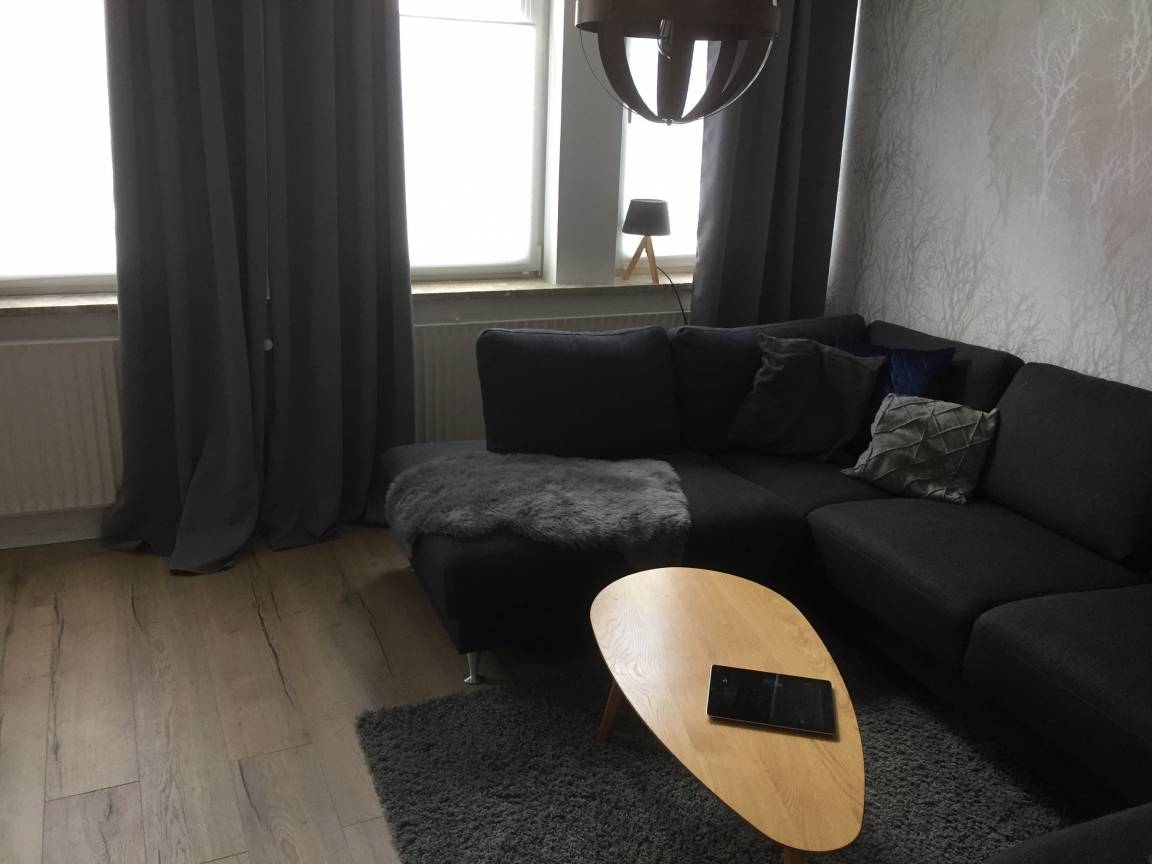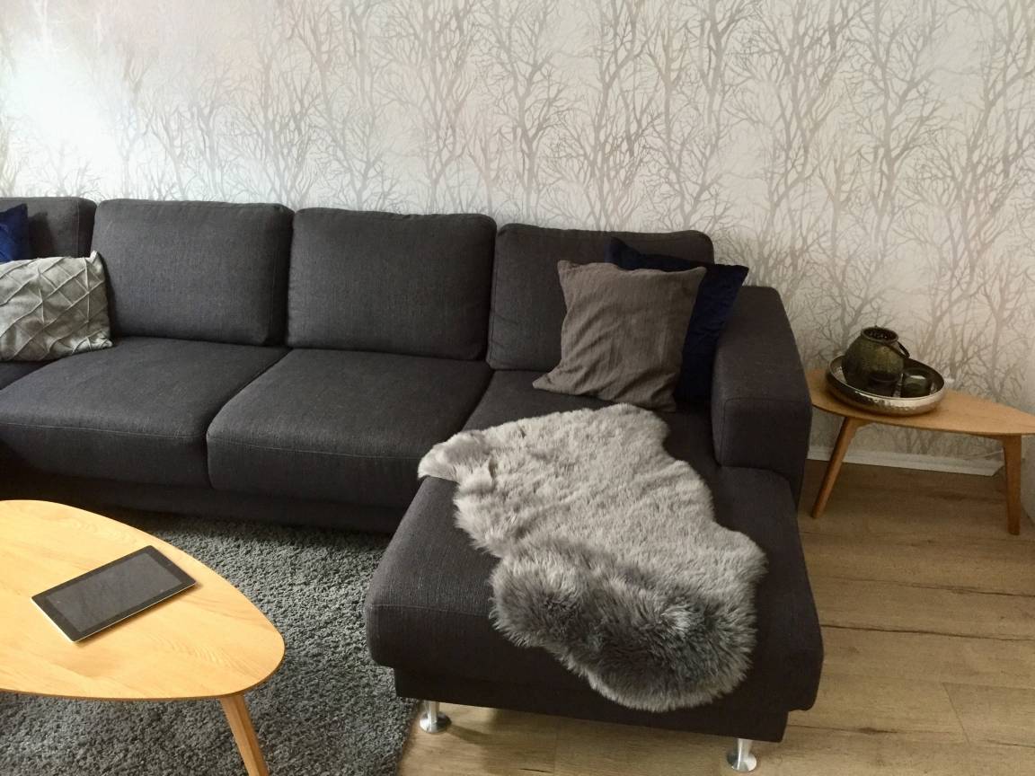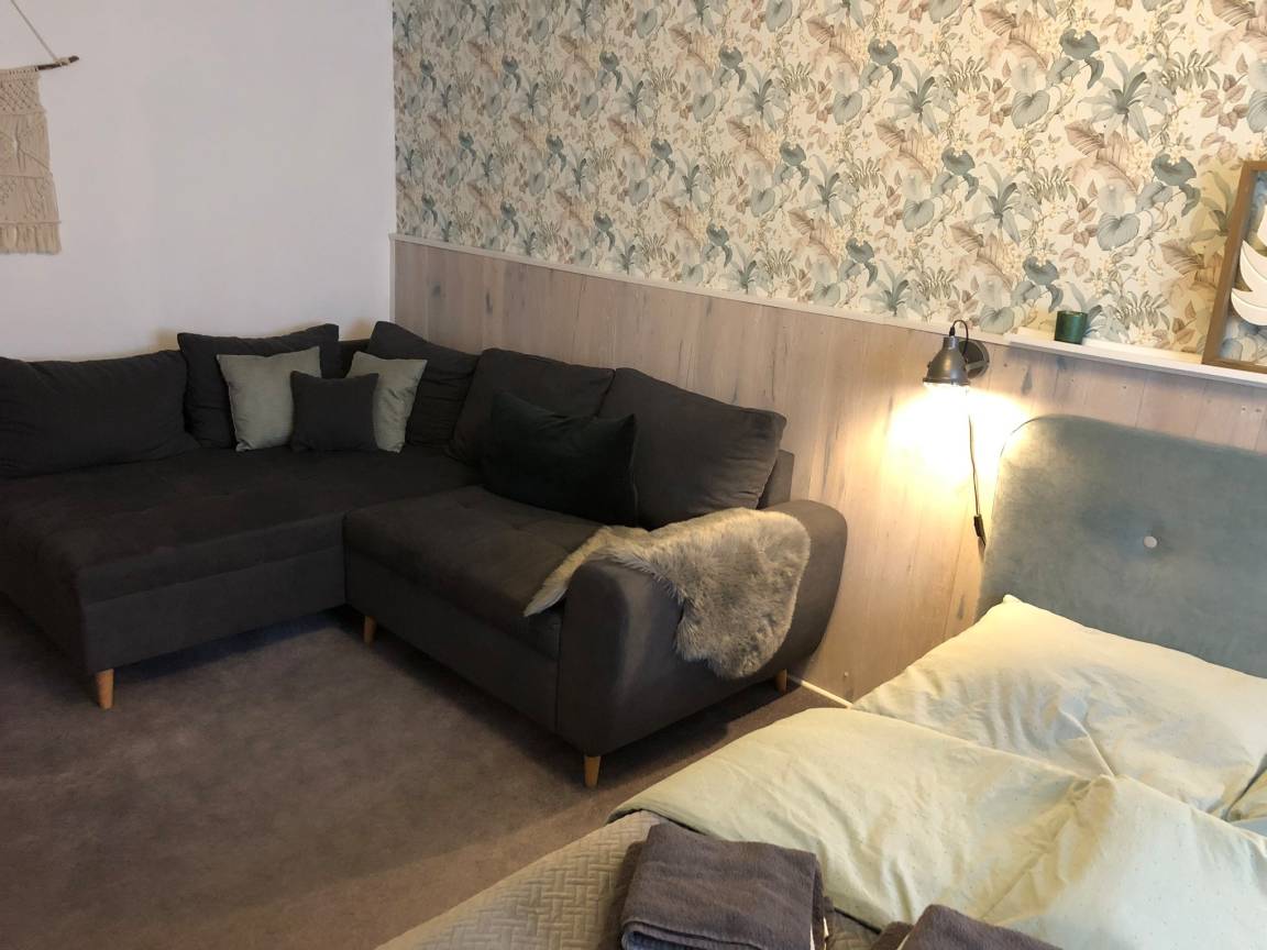und das gemütlichen Wohnzimmer mit großer Couch, einem Flachbild-TV, einem DVD/Bluerayspieler und einem kleinen Kinder-Bastel-und Maltisch.