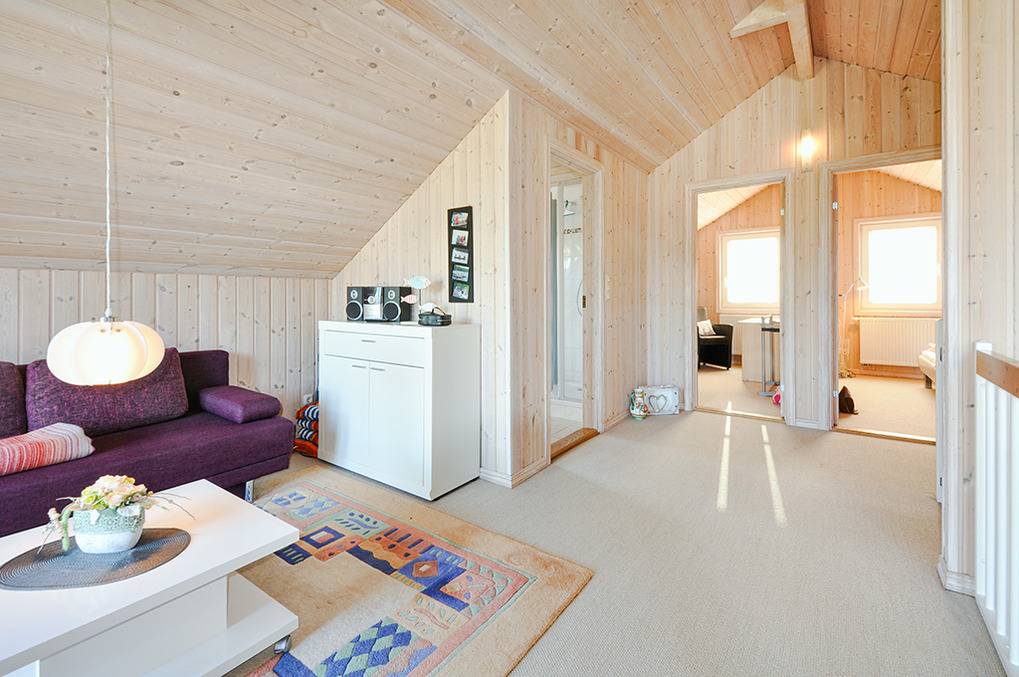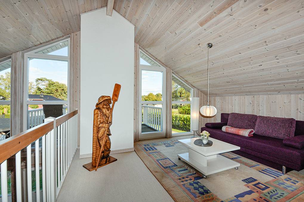 D 45.580 Ferienhaus 2-5 Pers.: Exklusives 4-Zimmerhaus mit 105 qm Wohnfläche. Parterre: Bis in den Dachgiebel ausgebauter, großzügiger Wohn-/Essraum mit Panorama-Fensterfront, Seeblick, Kamin, Sitzgruppe, Sat-TV, DVD, Radio/CD, Esstisch, gut ausgestatteter Einbauküche (Backofen, Mikrowelle, Spülmaschine). Doppelzimmer mit TV. Bad: Sauna, Whirlpool-Bw, Du, Wb, WC. Vom Wohnraum Treppe ins Dachgeschoss: Galerie, offen zum Wohnraum mit Sofa, Wasserblick. Doppelzimmer. 1-Bettzimmer mit Schreibtisch. Bad: Du, Wb, WC. Balkon mit Sitzmöbeln, schönem Seeblick.