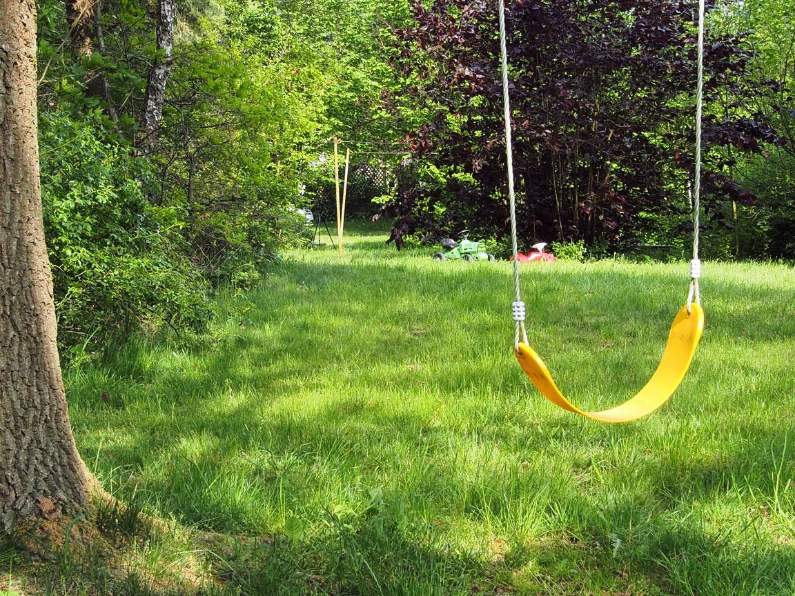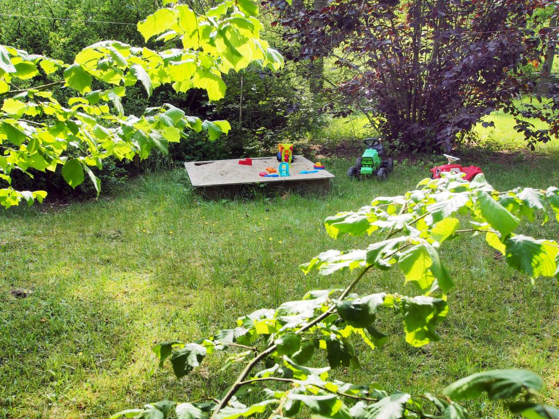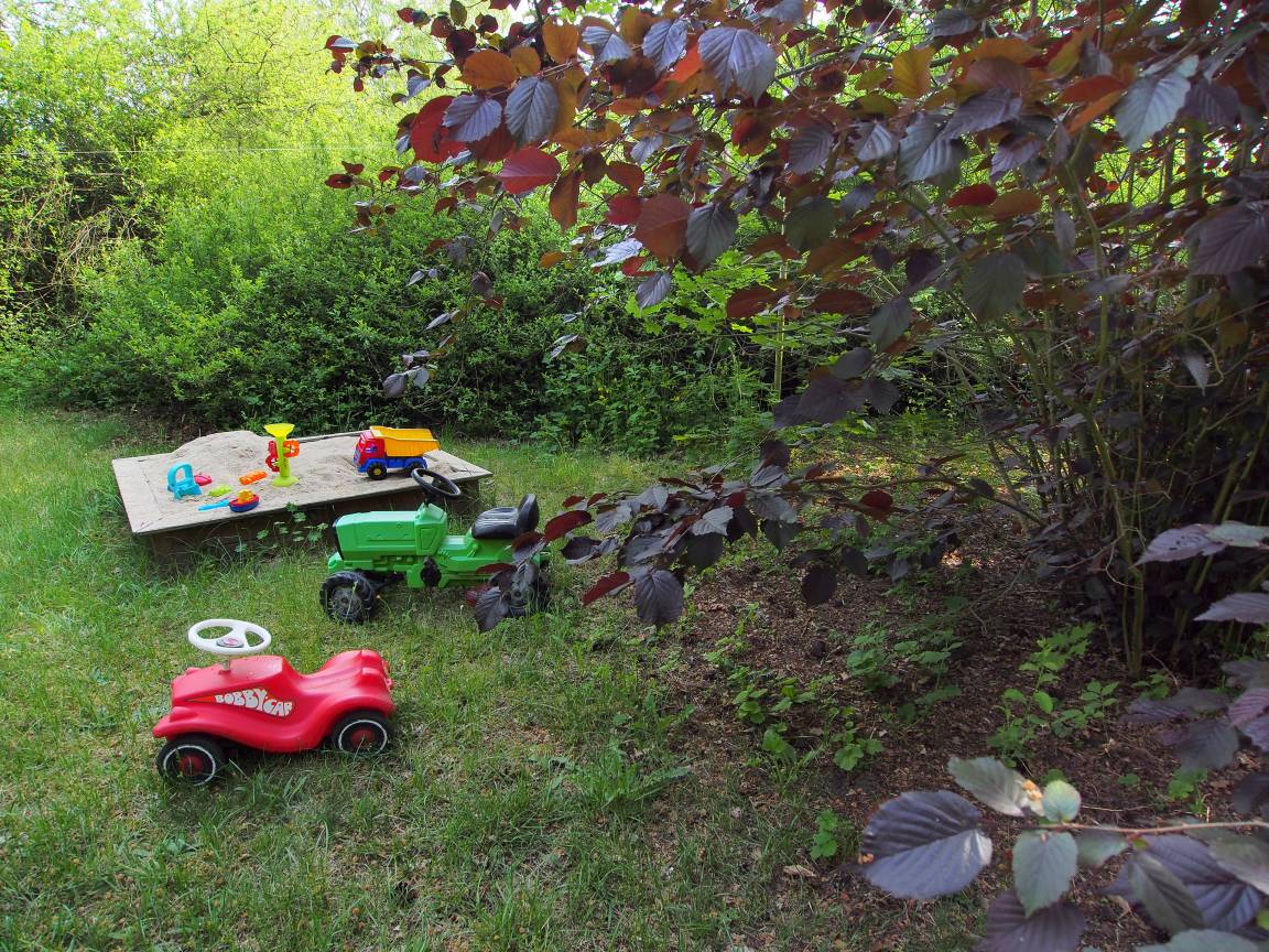 -- Sandkiste, Schaukel und ein großes natürliches Außengelände mit kleinem Wäldchen und Wiese zum Entspannen, Spielen und Entdecken