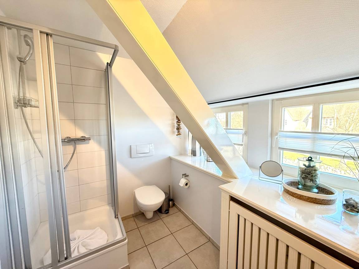 „14 Tage Erholung waren erwünscht. Das hat sich erfüllt! Die Wohnung ist sehr hübsch und liebevoll eingerichtet. Die Ausstattung vor allem in der Küche lässt keine Bedürfnisse offen. Jede Nische wird genutzt, das Reet sorgt für gute Isolierung, so entsteht auch die gemütliche Atmosphäre in der Dachgeschosswohnung. So viel Abstellfläche wie dieses Bad bietet, ist toll. Es steht ansprechende Literatur bereit, ebenso informatives Material über Föhr. Ich hätte nichts mitbringen müssen! Die Fenster (mit Fliegengittern!) liegen zu 3 Seiten (Süd, Ost, Nord), sodass man prima durchlüften kann. Ein paar Meter über den Hof steht der zur Wohnung gehörende Strandkorb auf einer gemähten Wiese hinterm Fußballplatz. Waschmaschine und Trockner funktionieren für je 4€ Gebühr gut. Dunsum ist als Ausgangsort für Spaziergänge und Radtouren prima gelegen. Einzig die Durchgangsstraße in unmittelbarer Nähe ist gut zu hören. Zum Glück herrschte meistens nur wenig Verkehr. Der Kontakt zum Vermieter war einfach und sehr zufriedenstellund. Wir hatten einen wunderschönen Urlaub mit Hund, danke!“