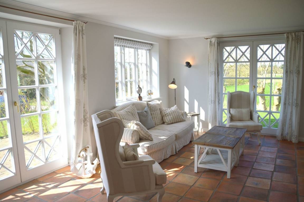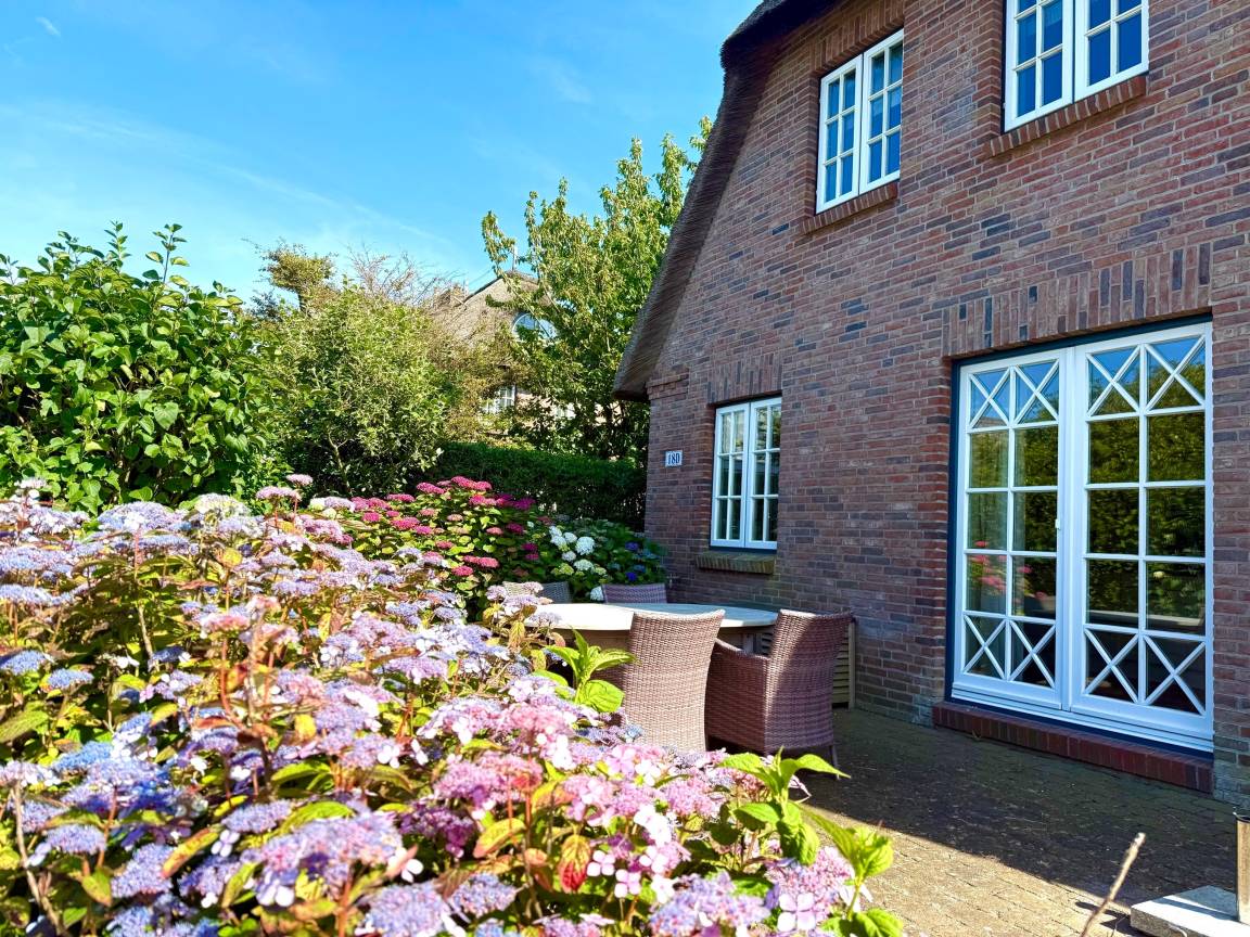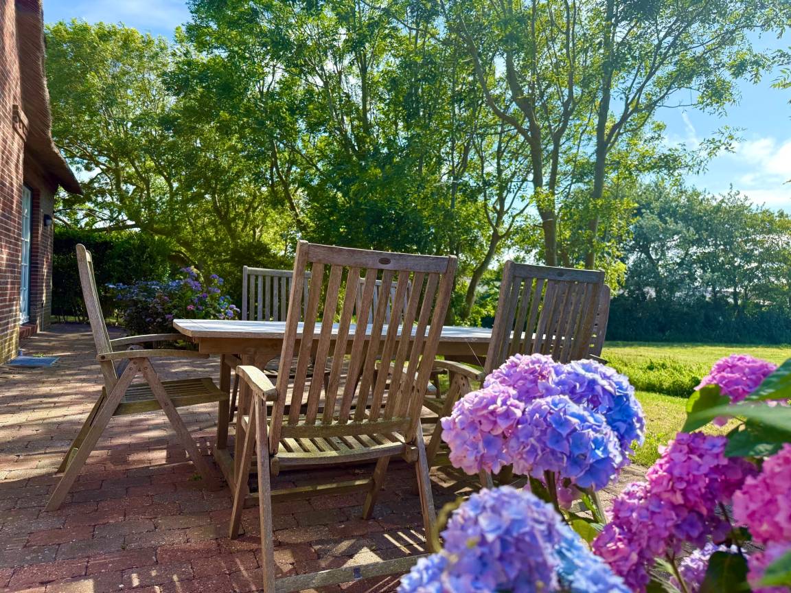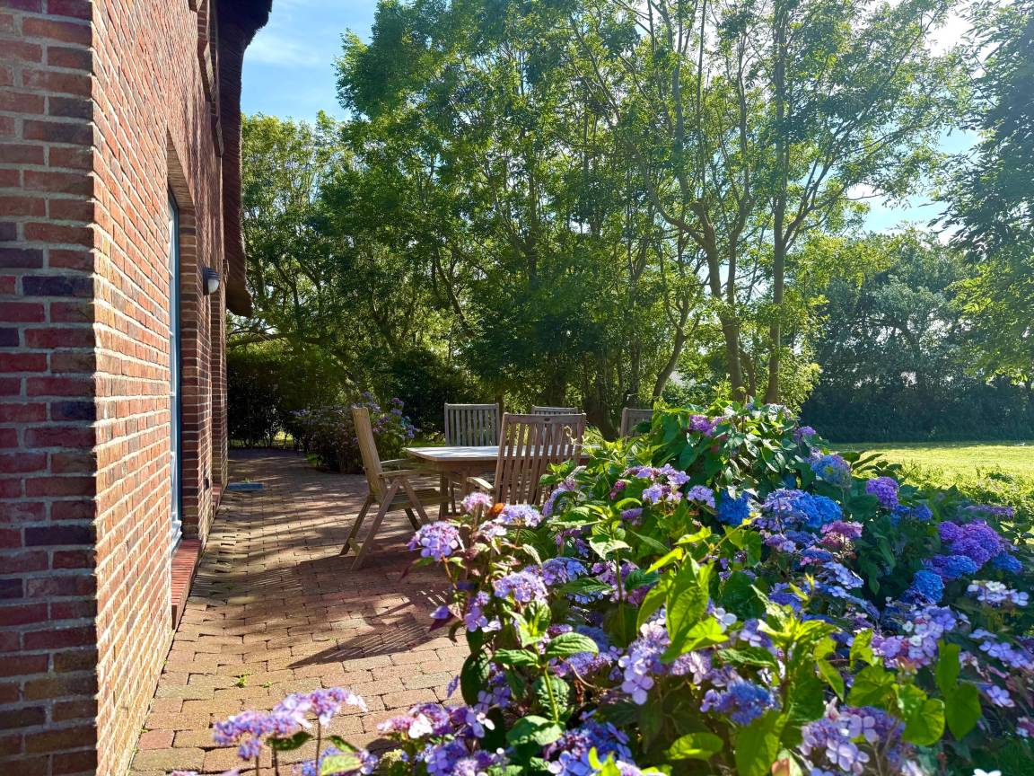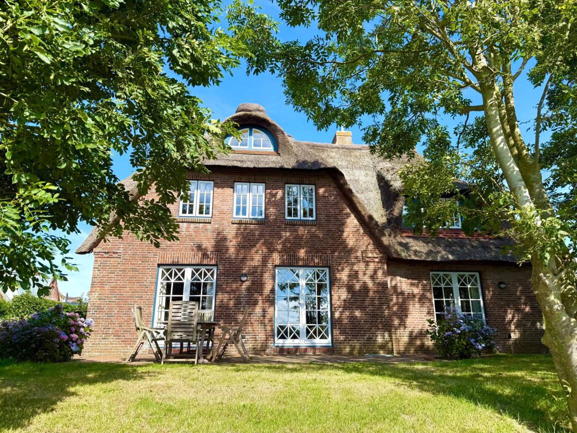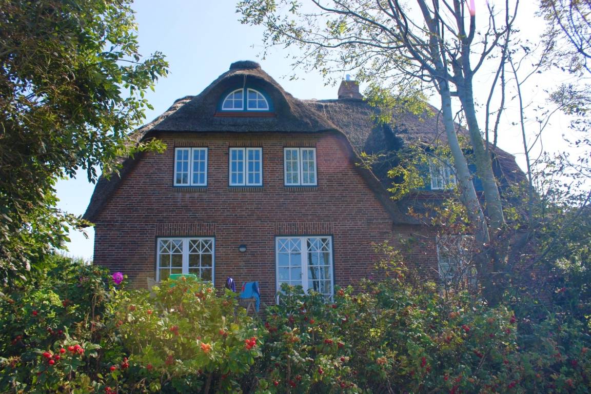 Angekommen und durchatmen, dieses Haus lässt keine Wünsche offen: von der kleinen Gruppe Reetdachhäuser liegt es in vorderster Front zur Natur mit freiem Panoramablick auf Wiesen und den Deich. Hier erleben Sie wohl die schönsten Sonnenuntergänge Föhrs direkt vor der Haustür. Genießen Sie die Großzügigkeit der lichtdurchfluteten Räume mit hochwertigen Terracotta-, Holzdielen- oder Parkettfußböden, und die einzigartigen Ausblicke aus jedem Fenster. Der 750 m² große Garten bietet Ihnen Flexibilität, tageszeit- und witterungsabhängig immer ein windgeschütztes Schatten- oder Sonnenplätzchen zum Wohlfühlen zu finden.