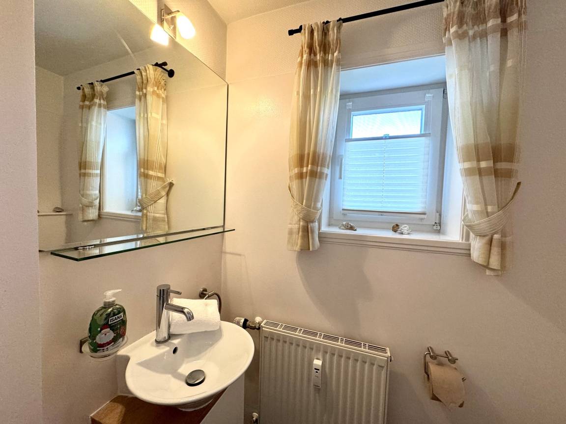„Sehr schöne Ferienwohnung, es ist absolut ruhig. Die Ausstattung war überdurchschnittlich gut, bequeme Betten, in der Küche alles was man braucht und es war wirklich sauber. Mein einziger Wunsch wäre, dass man ein Treppengitter (es lag im zweiten Schlafzimmer, war aber nicht zu montieren, weil Teile fehlten, bzw. defekt waren) hätte installieren können, da die Treppe schon sehr steil und der Flur oben recht eng. Auch unsere Kinder haben sich hier rundum wohl gefühlt - zum Toben auf dem Spielplatz und der großen Bolzwiese sind wir leider gar nicht gekommen... Was man verbessern könnte: Schlüsselabgabe - die sollte am anderen Ende von Wyk oder in Nieblum sein. Wenn wir ohne Auto angereist wären, hätte uns das bei dem einstündigen Bustakt und mit Kindern vor eine große Herausforderung gestellt, da die Ferienwohnung am anderen Ende der Insel ist.“