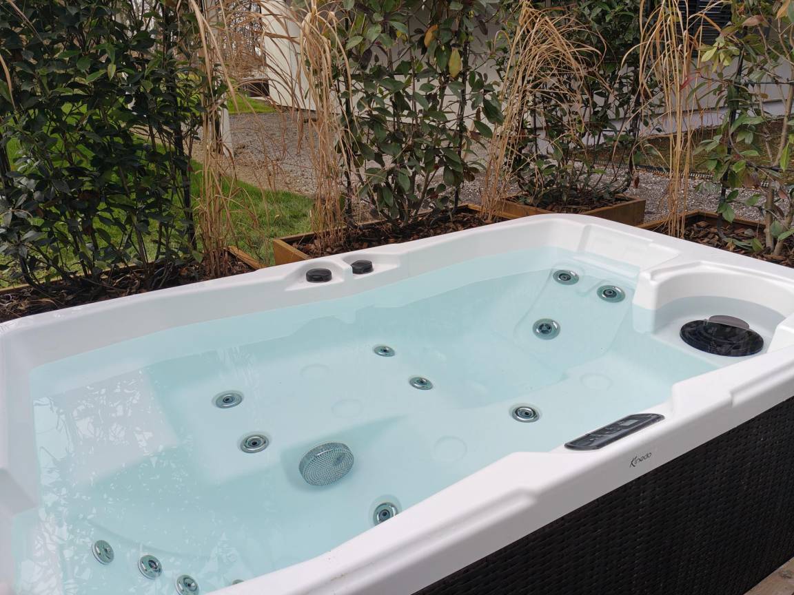 Layout : In der 1. Etage: Eingang, offene Küche mit Kochplatte(Induktion), Wasserkocher, Toaster, Dunstabzugshaube, Kaffeemaschine(cups), Backofen, Kombi-Mikrowelle, Geschirrspüler, Kühlschrank, Tiefkühlschrank , Wohn/Esszimmer mit TV(Flatscreen, digital, smart TV), Esstisch, Sitzecke , Schlafzimmer mit Doppelbett(Doppelbettdecke) , Schlafzimmer mit Doppelbett(Doppelbettdecke) , Badezimmer mit Dusche(ebenerdige Dusche, Regen), 2x Waschbecken, Föhn , Toilette mit Toilette , Abstellraum, 1x Garage(über gemeinsamen Eingang, auf dem Gelände, 1 Parkplatz), Terrasse(alleinige Nutzung, 33 m²) mit Wellness Badewanne(alleinige Nutzung, im Garten) , Fahrradabstellraum, Gartenmöbel, 1x Parkplatz(auf dem Gelände, auf allgemeinen Parkplatz)