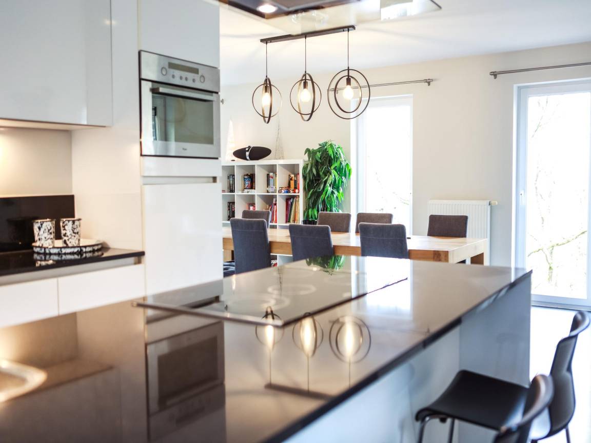 Layout : Parterre: Wohnzimmer mit TV(Flatscreen, digital, smart TV), Ofen(Holz), Sitzecke , Esszimmer mit Esstisch , offene Küche mit Kochplatte, Toaster, Dunstabzugshaube, Kaffeemaschine(cups, Filter), Backofen, Mikrowelle, Geschirrspüler, Kühlschrank, Tiefkühlschrank , Toilette mit Toilette