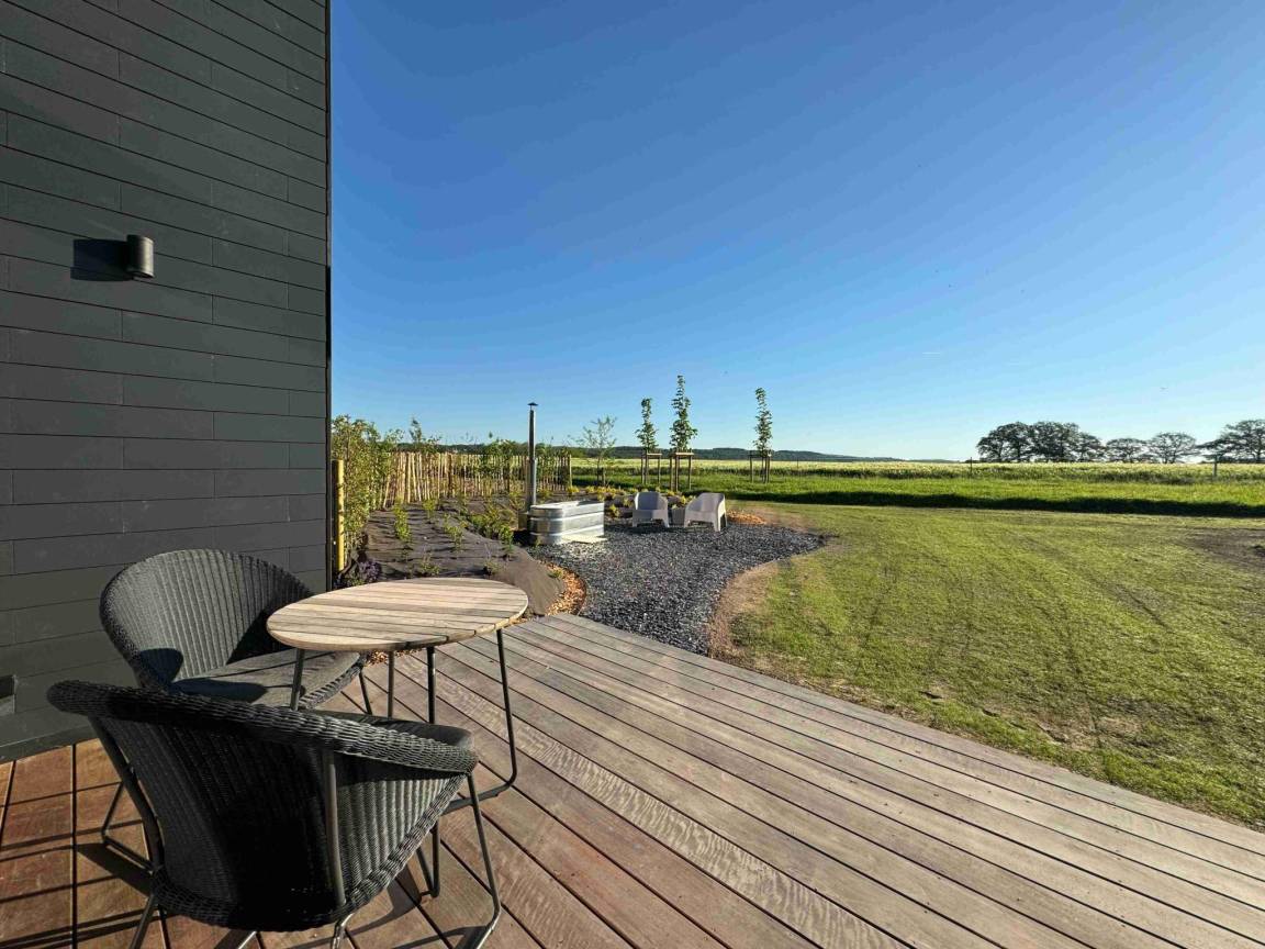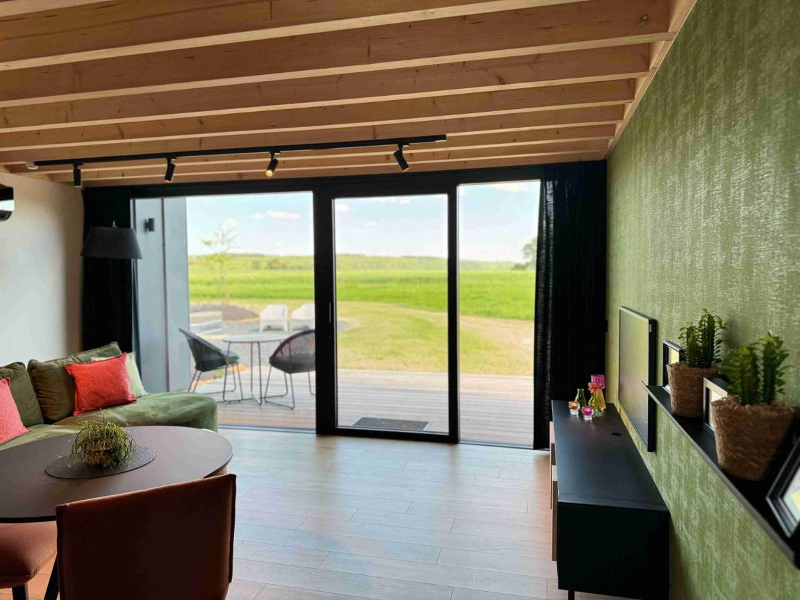 Hausbeschreibung : Genießen Sie einen unbeschwerten Urlaub von dieser Lodge in der Nähe von Durbuy. Im Erdgeschoss finden Sie eine Küchenzeile und Wohnzimmer mit TV. Im Obergeschoss befindet sich das Schlafzimmer mit XL-Doppelbett und ein offenes Badezimmer mit Duo-Badewanne mit Panoramablick. Lesen Sie Ihr Lieblingsbuch auf der halb überdachten Terrasse oder machen Sie es sich im privaten Entspannungsbereich mit Whirlwanne und Liegestühlen gemütlich. Als i-Tüpfelchen gibt es auch einen Gemeinschaftspool!