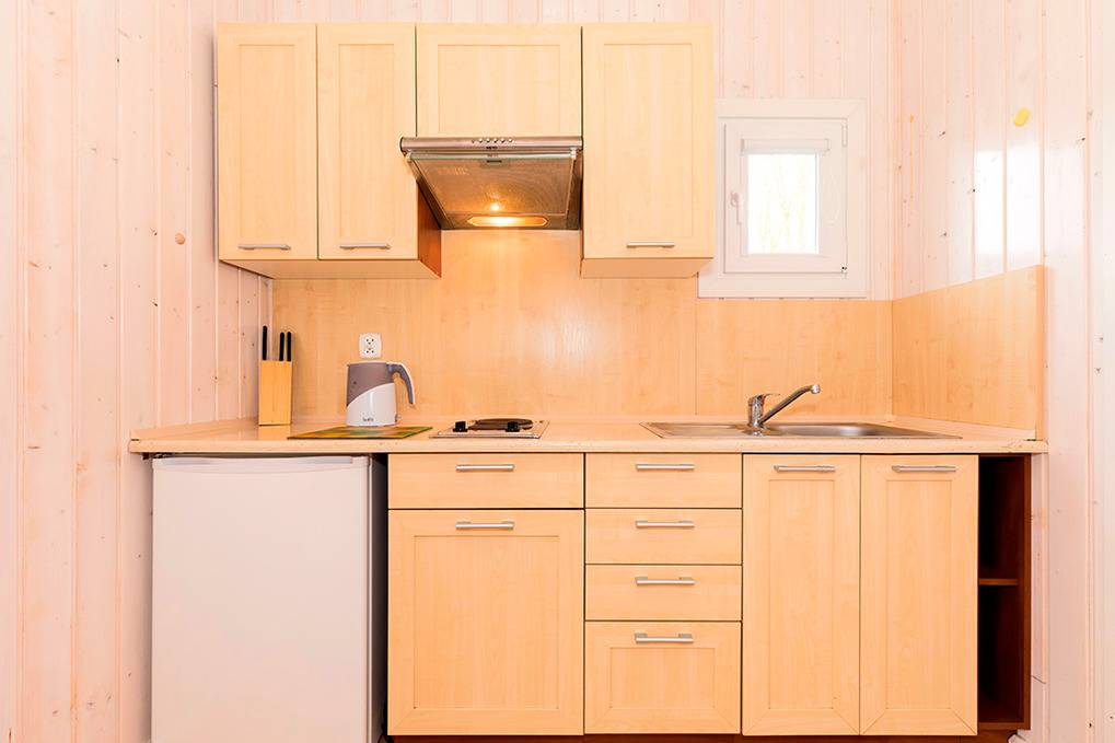 Gemütliche Ferienhäuser mit funktionaler Einrichtung aus hellen Kiefernholzmöbeln. E-Heizung, Warmwasser über E- Boiler (80 l). Überdachte Terrasse. 1 Parkplatz pro Ferienhaus (Gebühr, bewacht nur Juli, August). Internet über WLAN im Rezeptionsbereich.