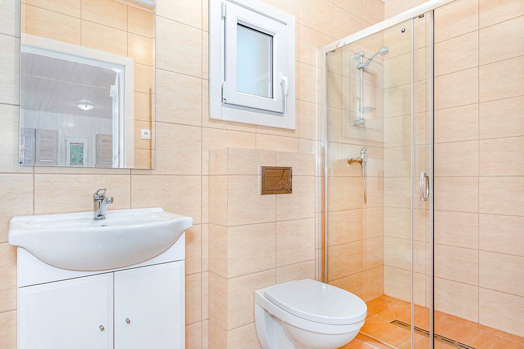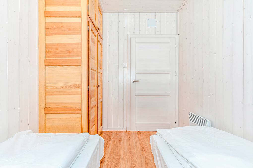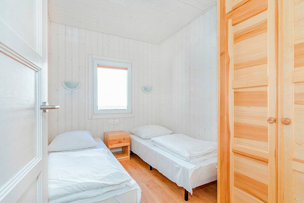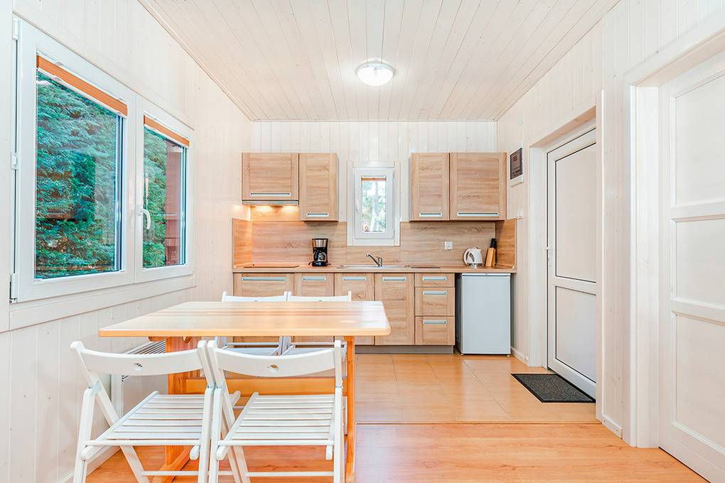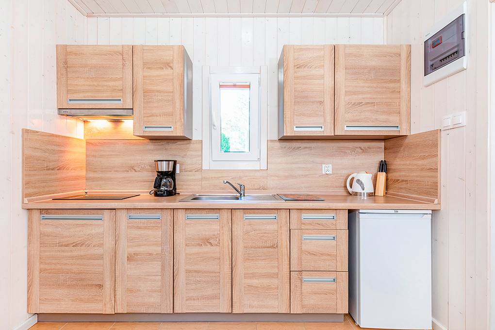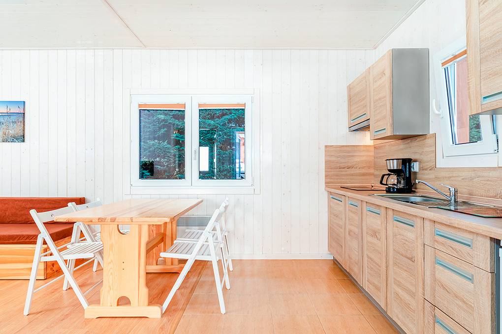 Ferienhäuser mit moderner Einrichtung aus hellen Kiefernholzmöbeln, 2019 neu erbaut. E-Heizung, Warmwasser über E- Boiler (80 l). Überdachte Terrasse. 1 Parkplatz pro Ferienhaus (Gebühr, bewacht nur Juli, August). Internet über WLAN nur im Rezeptionsbereich.