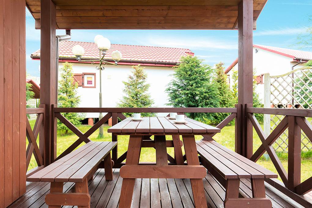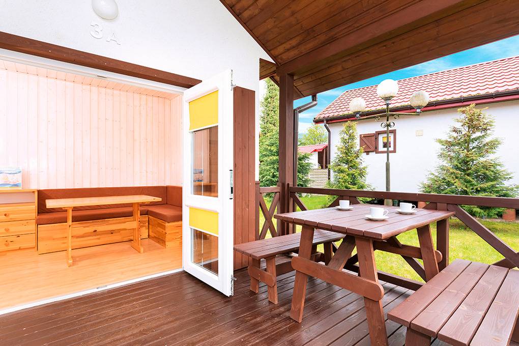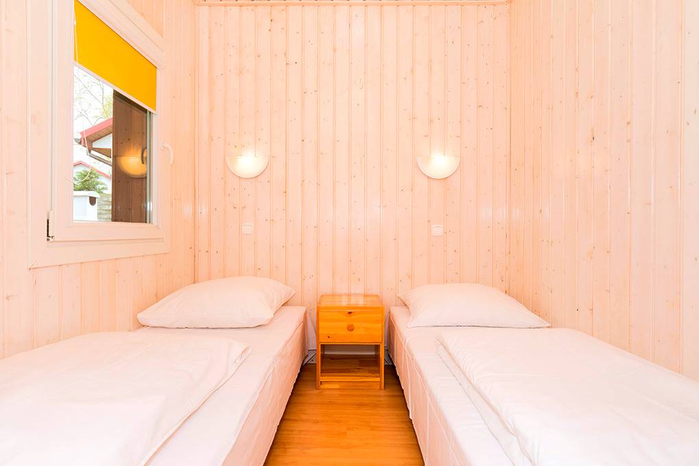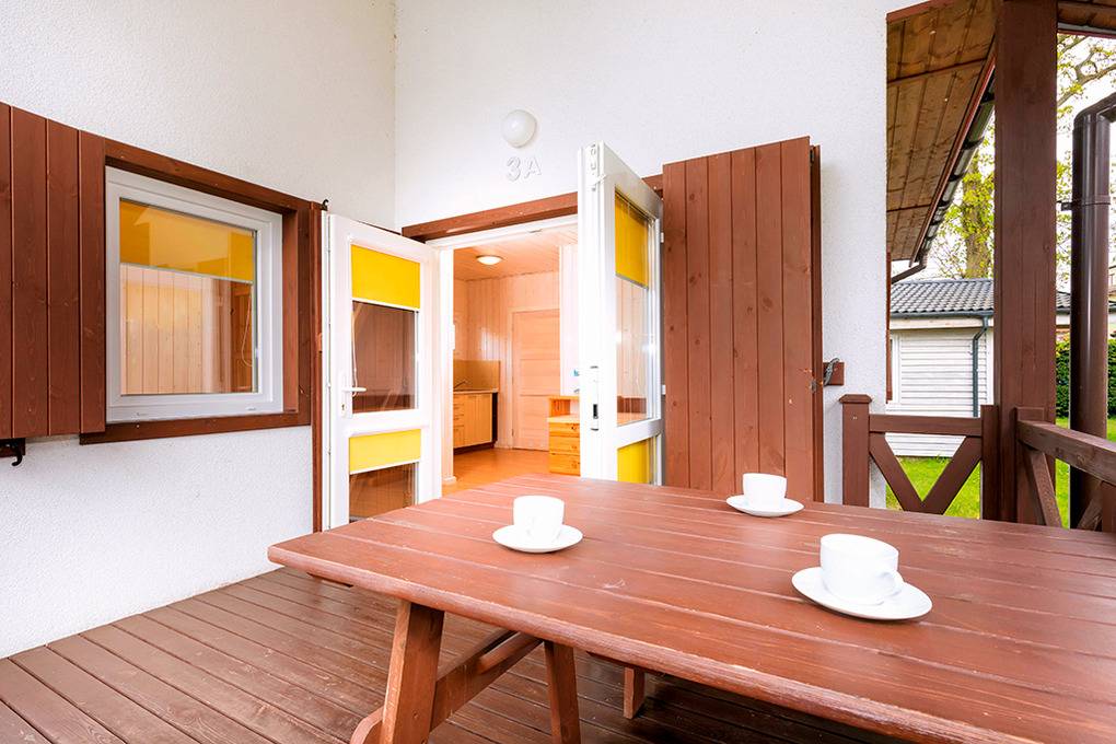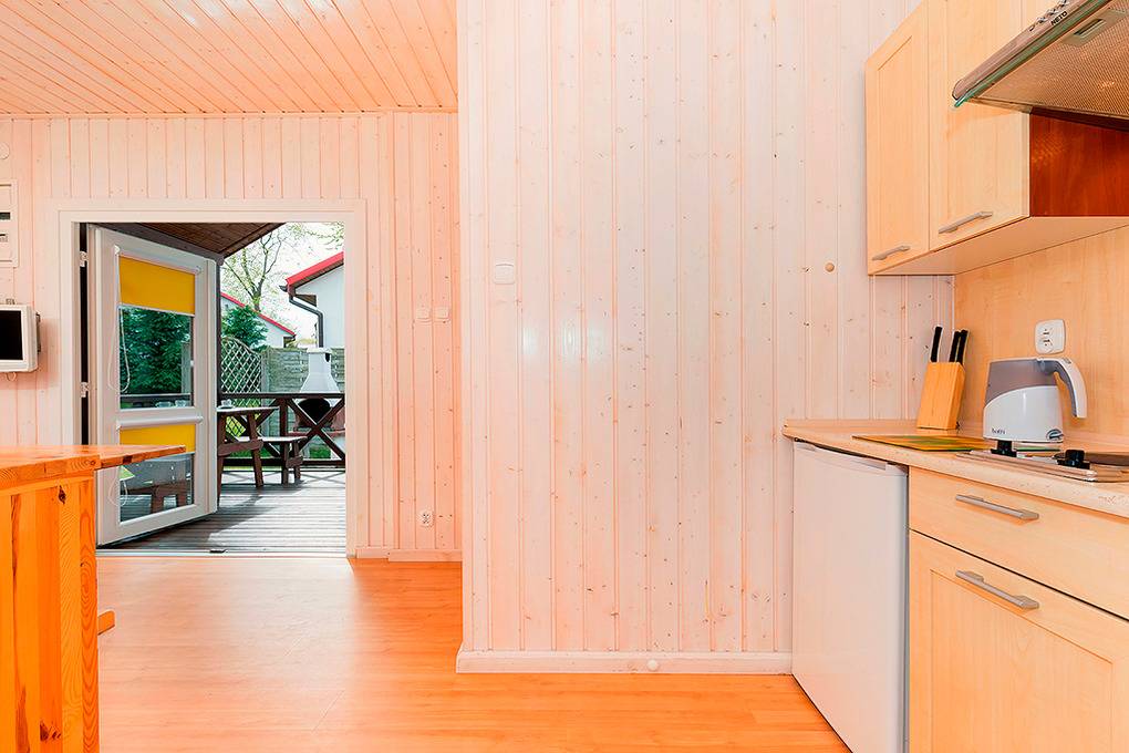 Gemütliche Ferienhäuser mit funktionaler Einrichtung aus hellen Kiefernholzmöbeln. E-Heizung, Warmwasser über E- Boiler (80 l). Überdachte Terrasse. 1 Parkplatz pro Ferienhaus (Gebühr, bewacht nur Juli, August). Internet über WLAN im Rezeptionsbereich.