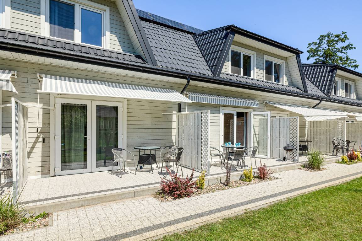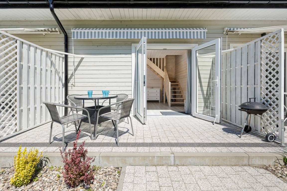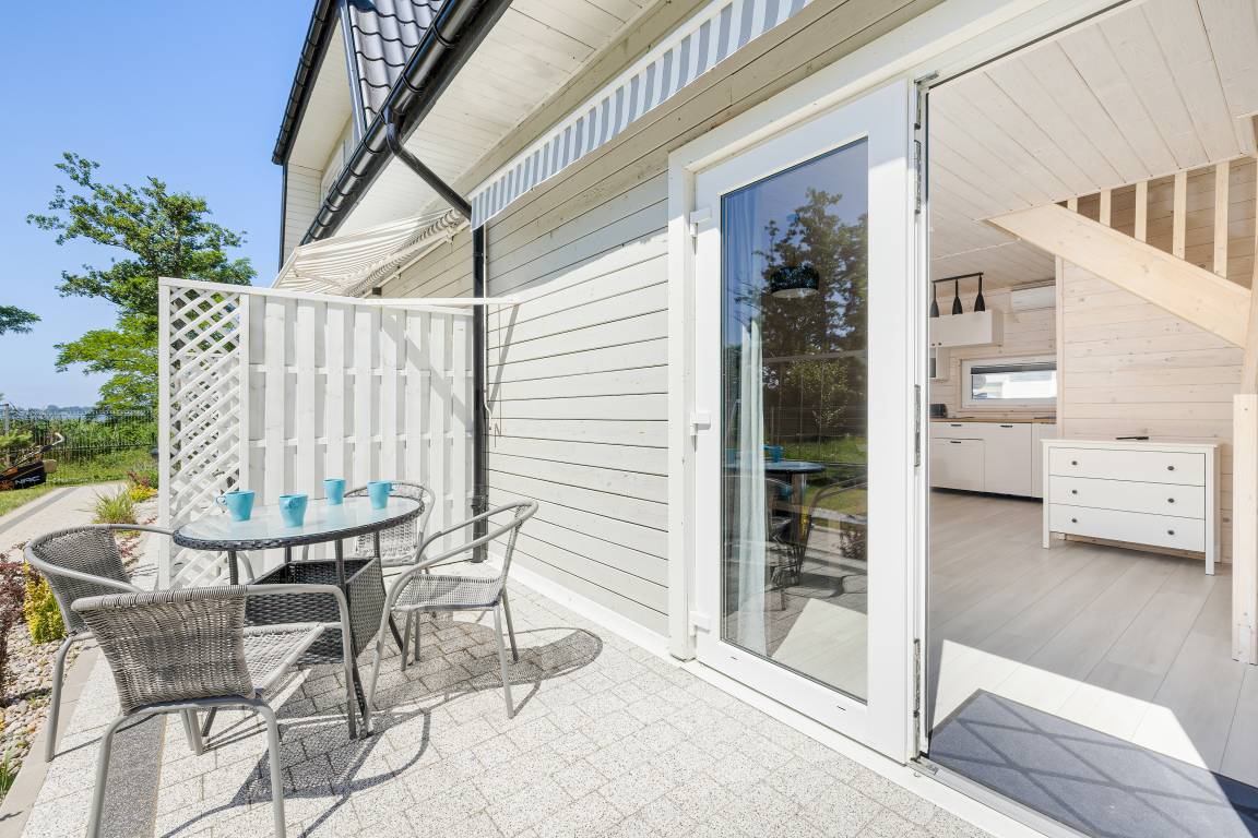 PL 38.22 Ferienhaus 2-6 Pers.: Gemütliche 3-Zimmerhaushälfte mit 50 qm Wohnfläche über 2 Etagen. Parterre: Wohn-/Essraum mit Sofa (Klappcouch 2 Pers), Flachbild-TV, Esstisch, Küchenzeile (2 Induktions-Platten, Mikrowelle, Spülmaschine). Klimaanlage mit Heizfunktion. Bad/WC. Dachgeschoß mit Schrägen: 2-Bettzimmer. Doppelzimmer mit franz. Bett, seitlichem Wasserblick. Terrasse mit Sitzmöbeln.