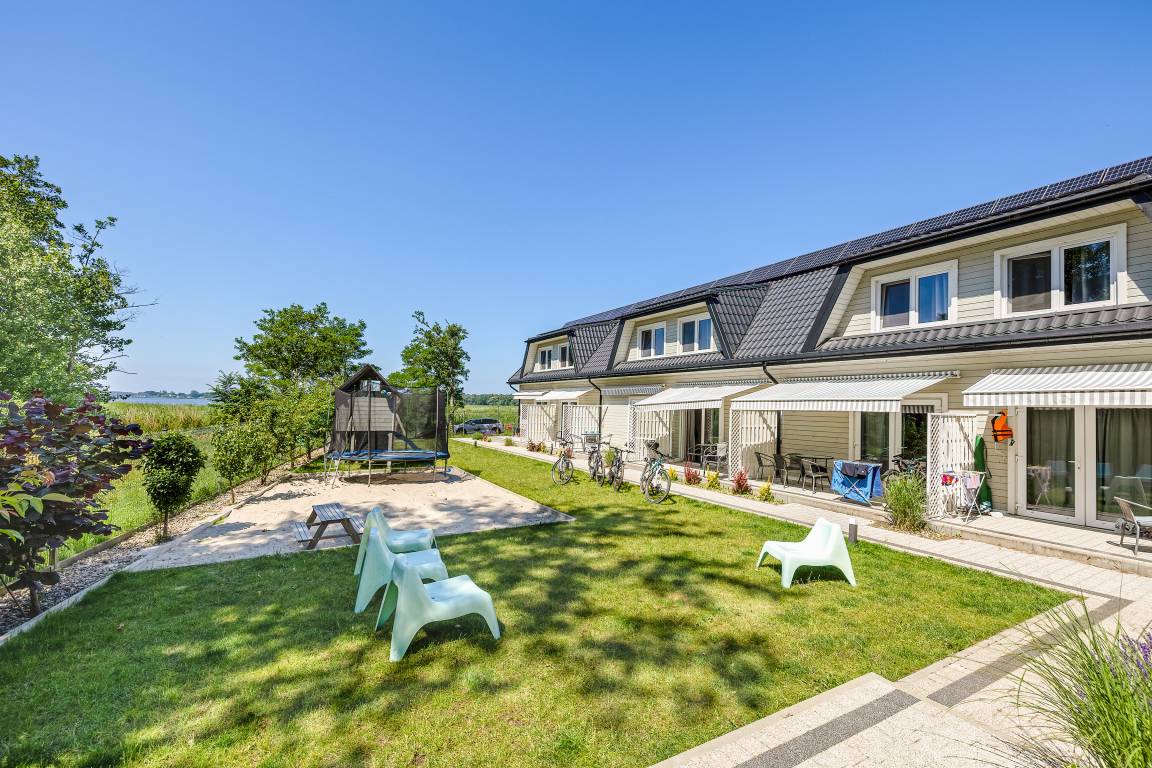 Haus: Kleine Ferienhausanlage mit acht Doppelhaushälften auf einem 2000 qm großen Rasengrundstück, 2022 neu erbaut. In der Anlage: Kinderspielplatz mit großem Sandkasten, Schaukeln, Klettergerüst, Rutsche. Direkt vor der Anlage: Wassersportschule mit Materialverleih (Kite-, Surfausrüstung, Kajak, Ruderboot, Tretboot), Frosch-Gäste erhalten hier 10% Rabatt.