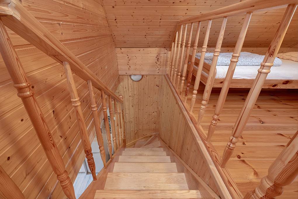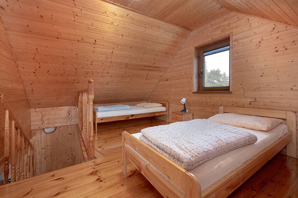 PL 43.8 Ferienhaus 2-7 Pers.: Schönes 4-Zimmerhaus mit 60 qm Wohnfläche über 2 Etagen. Parterre: Wohn-/Essraum mit rustikaler Holzbalkendecke, Eckcouch, Sitzwürfeln, Sat-TV, Internet (WiFi), Esstisch, moderner Küchenzeile (4 E-Pl. Ceranfeld, Mikrowelle, Spülmaschine, Kaffeemaschine, Toaster). Doppelzimmer mit franz. Bett. Bad: Du, Wb, WC, Waschmaschine. Vom Wohnraum Holztreppe ins holzvertäfelte Dachgeschoss: Offenes 2-Bettzimmer. Dahinter 3-Bettzimmer mit franz. Bett, Einzelbett. Überdachte Terrasse mit Sitzmöbeln.