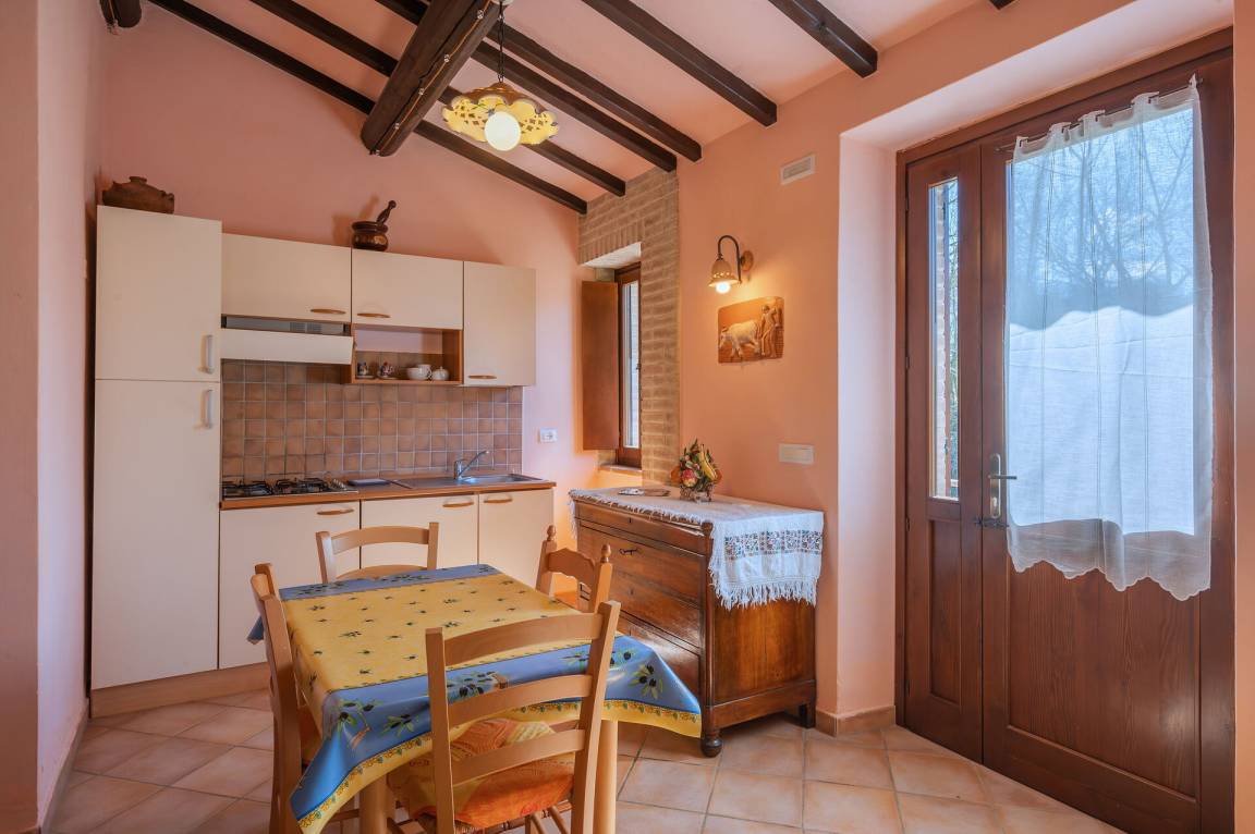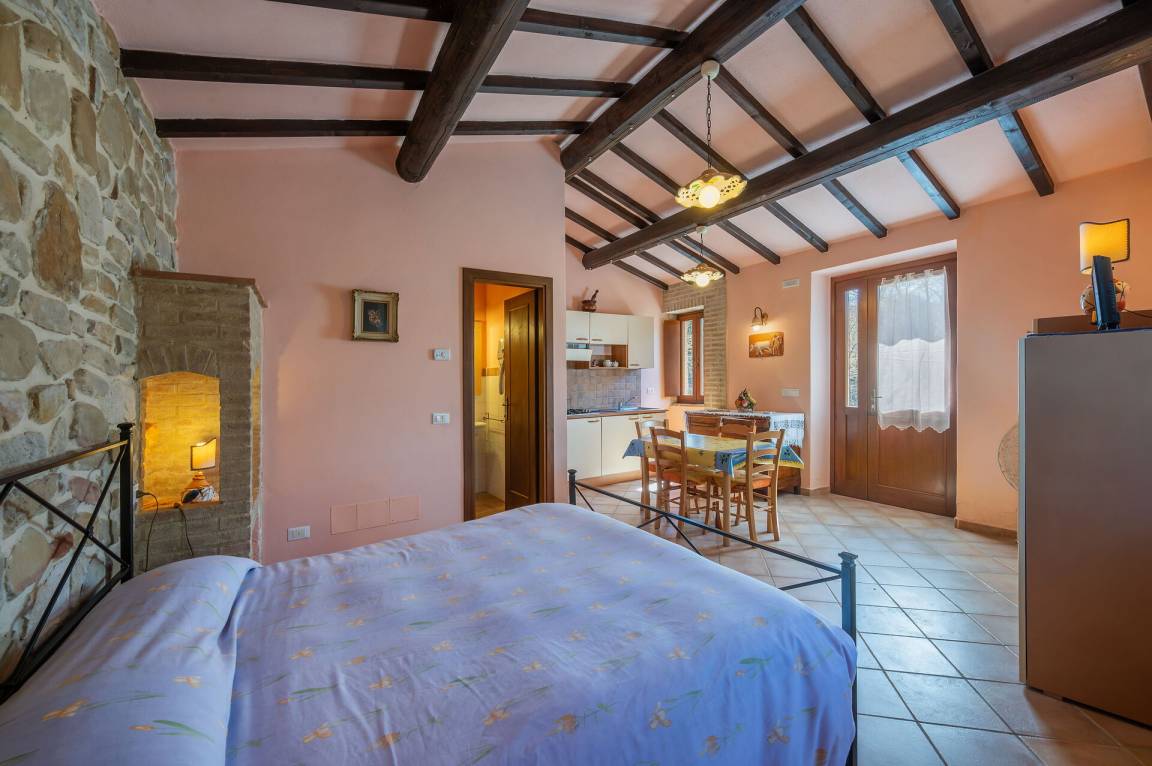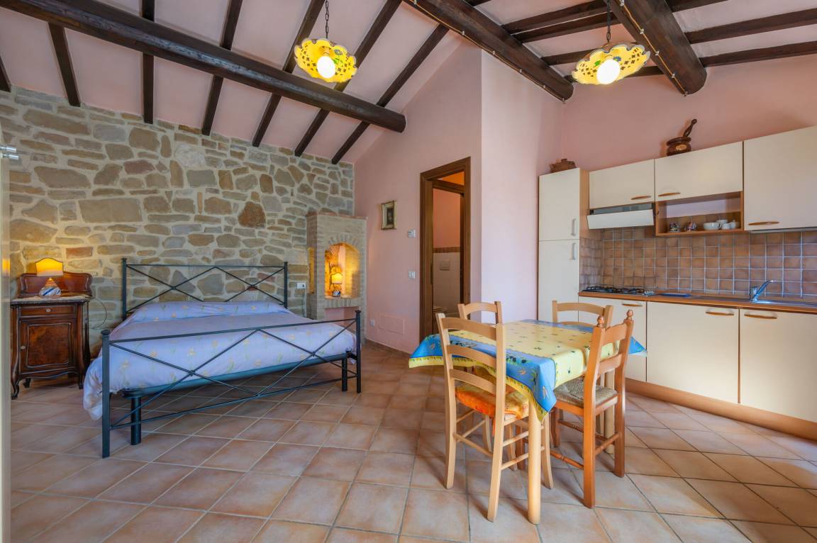 offener Raum: Esstisch, Doppelbett, WiFi Internet, Klimaanlage, TV, Fliegengitter, Kühlschrank, Ofen, Italienische Kaffeemaschine, Ausgang auf den Garten, Ausgang auf die Terrasse.