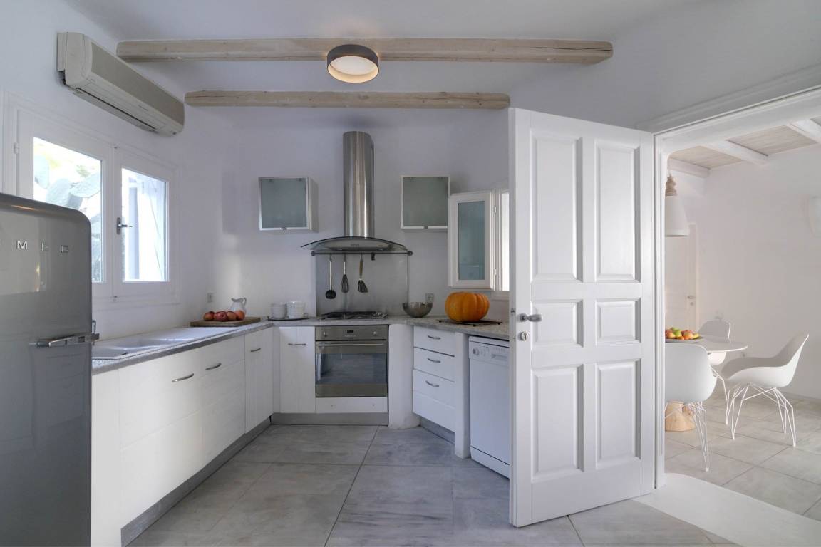 Die Küche verfügt über eine Geschirrspülmaschine und eine Mikrowelle. Die Villa ist mit Klimaanlage für wärmere Monate und Heizung für kühlere Perioden ausgestattet; eine Waschmaschine steht zur Verfügung. Ein Fernseher ist vorhanden. Die Außenbereiche umfassen eine private Terrasse und einen privaten Garten.