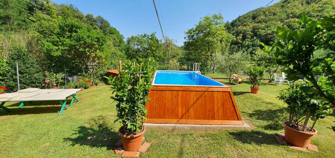 Garten: Schwimmbad (Breite: 2.8m, Länge: 6.6m, Tiefe: 1m), Außenbereich für das Essen im Freien, Esstisch, Gartenmöbel.