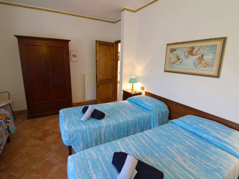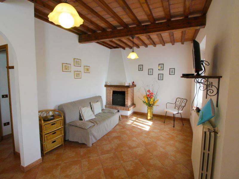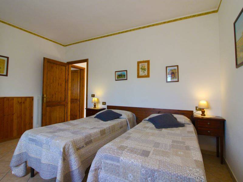 Wohnung im ersten Stock mit Eingang von der Außentreppe, bestehend aus einem großen Wohn-Esszimmer mit Kochnische, Kamin und Sofa, Schlafzimmer mit Doppelbett, Schlafzimmer mit zwei Einzelbetten und Bad mit Dusche.