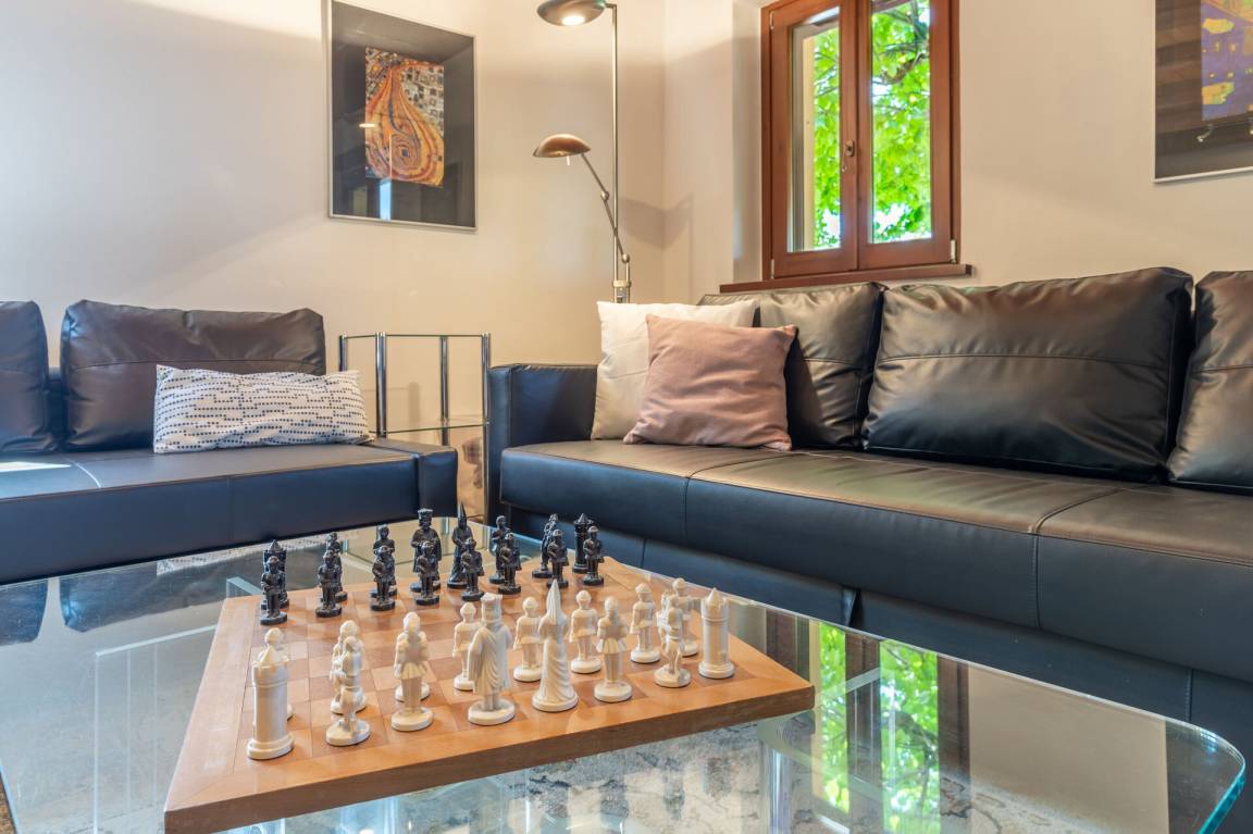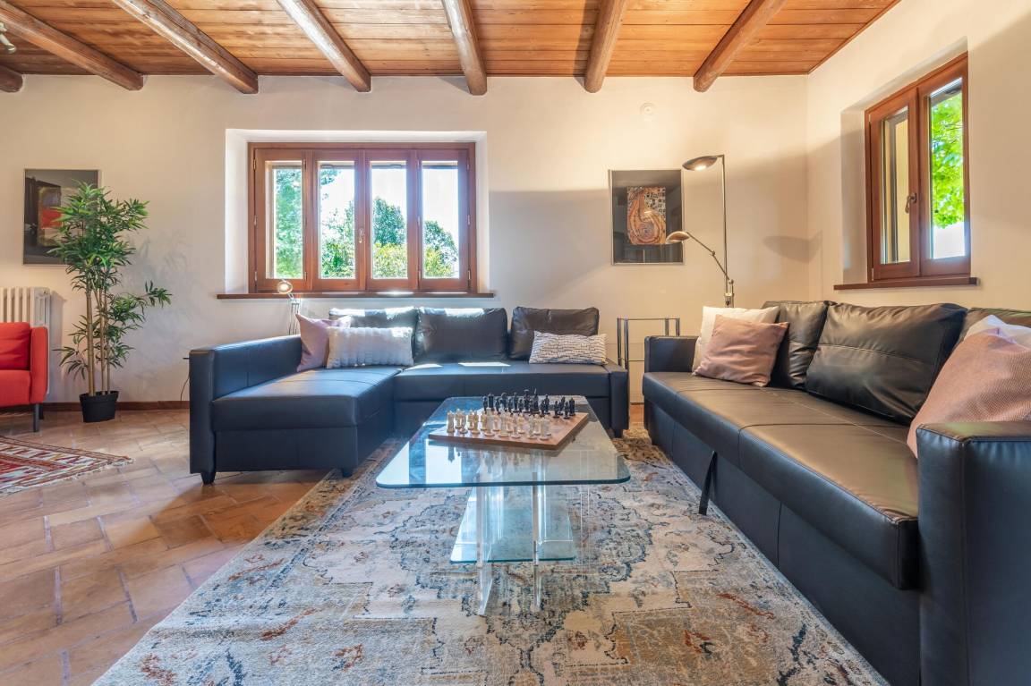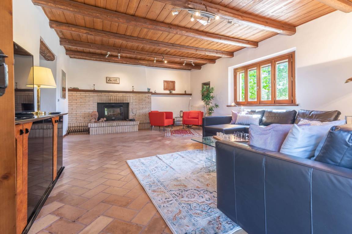 Wohnzimmer: Sofa, Schreibtisch, Kamin, Doppel-Schlafsofa, WiFi Internet, TV, Ausgang auf den Garten.