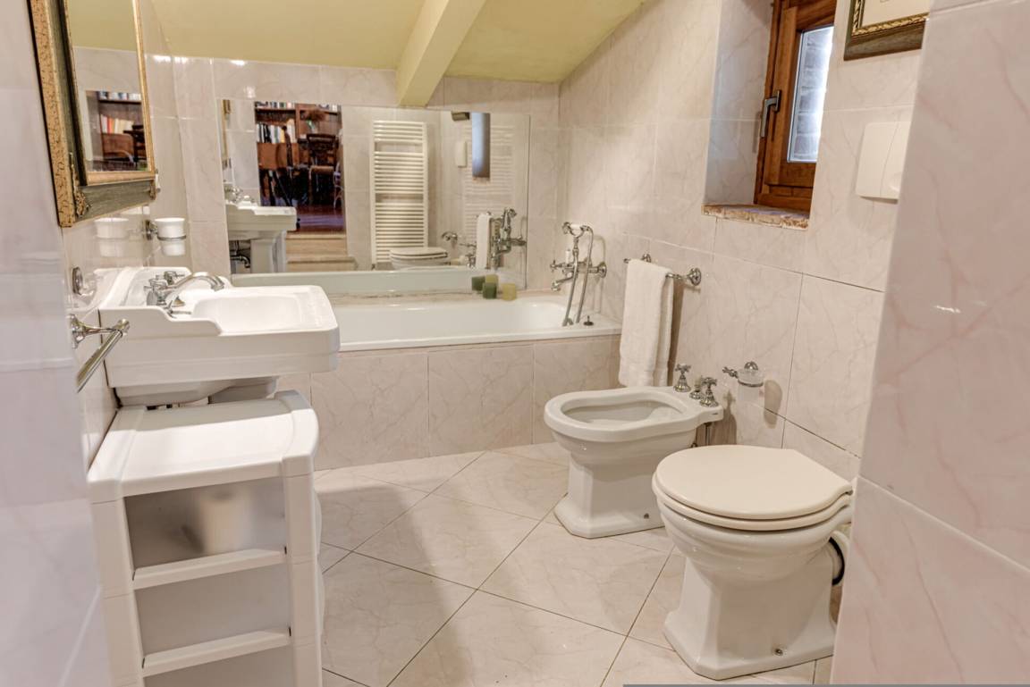 Badezimmer: Waschbecken, WC, Bidet, Badewanne.
