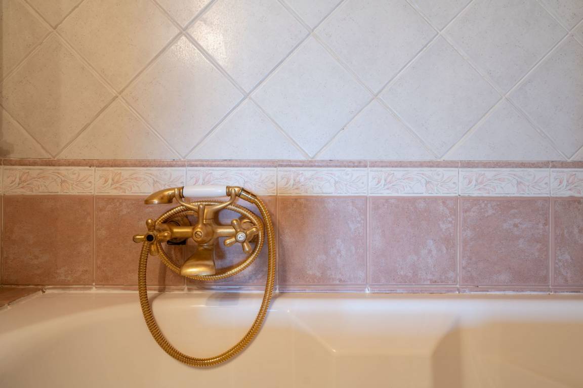 Badezimmer: Whirlpool-Badewanne, Waschbecken, WC, Bidet.