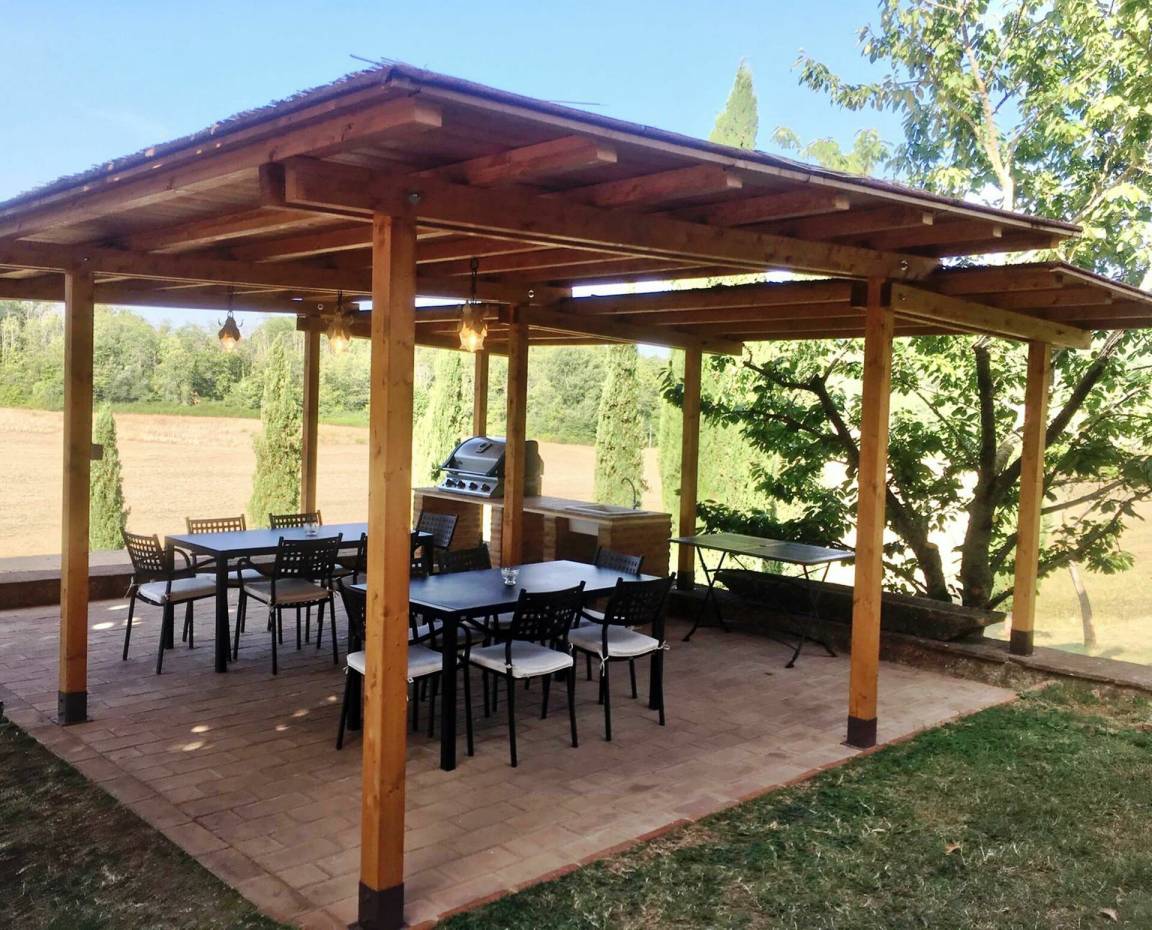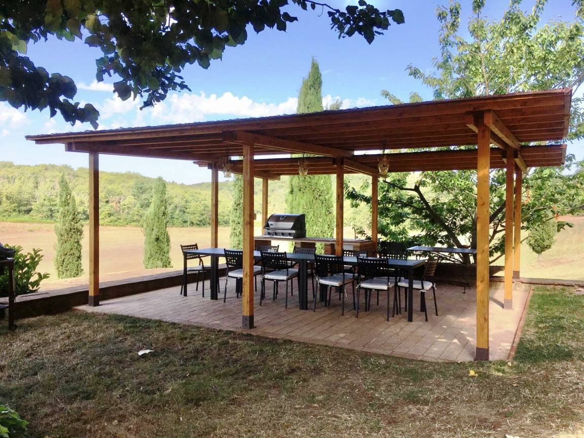 Garten (1000 m²): Schwimmbad, Heißwasser-Whirlpool im Freien, Dusche, WiFi Internet, Grill, Außenbereich für das Essen im Freien, Esstisch (Personen: 14), Pavillon, Gartenmöbel, 14 Sonnenliegen, Kinderspielplatz.
