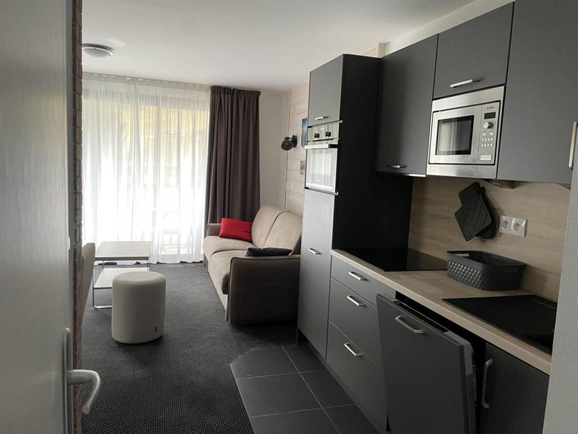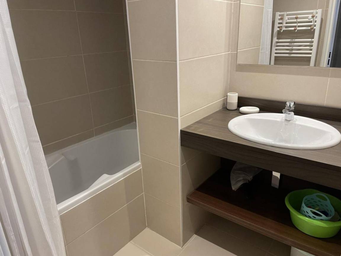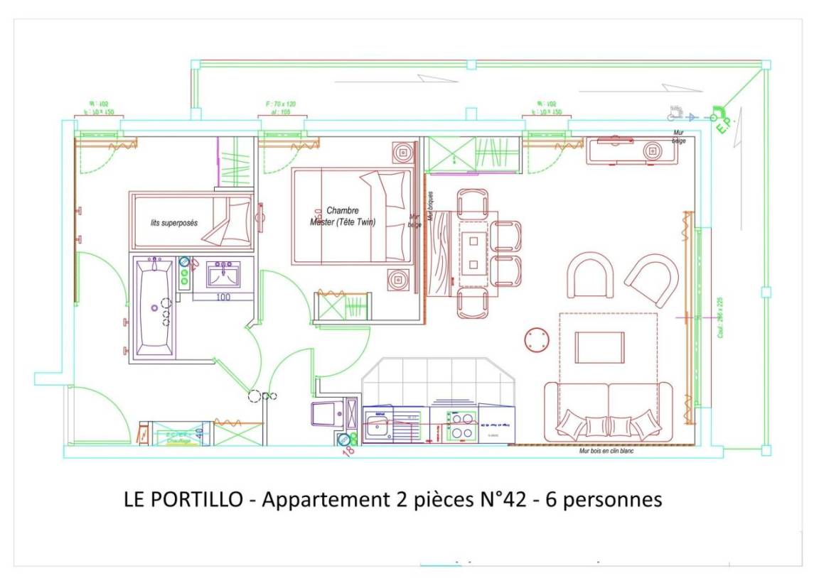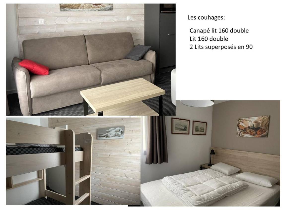 Fläche von ungefähr 49 m². 3te Etage. Orientierung : Süd. Blick berg und Skipisten. Wohnzimmer mit Klappschlafcouch (160). Schlafzimmer mit 2 Stockbetten (90). Schlafzimmer mit Doppelbett (160). Küche mit Wasserkocher, Kaffeemaschine, Backofen, Toaster, Geschirrspülmaschine, Mikrowellenherd, 4 Herdplatten, Kühlschrank. WC. Badezimmer mit Badewanne, Haartrockner. Balkon. Die oberen Betten sind nicht für Kinder unter 6 Jahren geeignet.