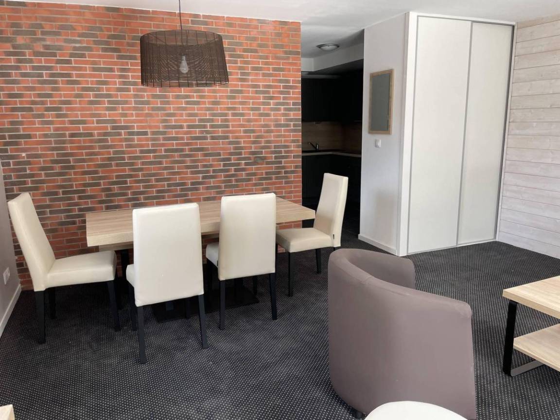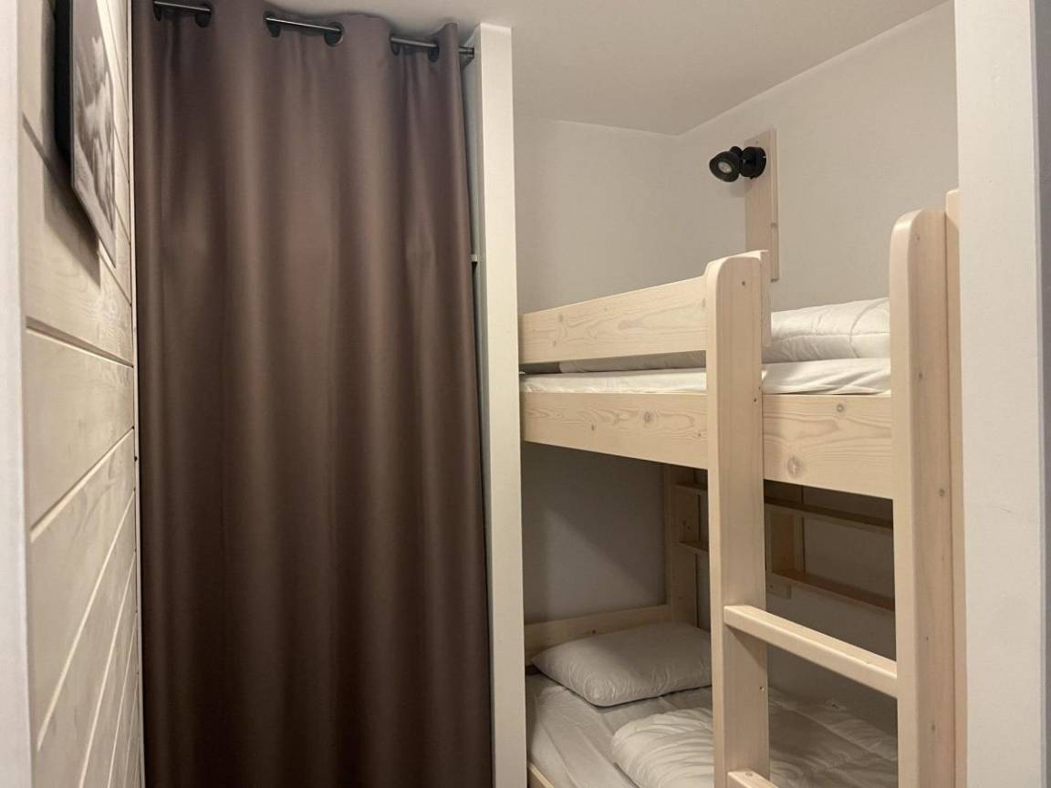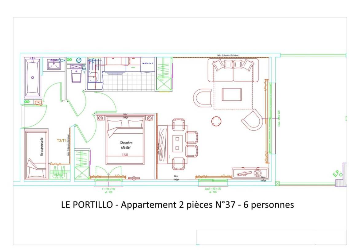 Fläche von ungefähr 49 m². 3te Etage. Orientierung : Süd. Wohnzimmer mit Klappschlafcouch (160). offener Schlafbereich mit 2 Stockbetten. Schlafzimmer mit Doppelbett (160). Kochnische mit Wasserkocher, Kaffeemaschine, kleiner Backofen mit Mikrowellenfunktion, Toaster, Geschirrspülmaschine, Glaskeramikkochfelder, Kühlschrank. Badezimmer mit Badewanne, Haartrockner. separates WC. Terrasse. Die oberen Betten sind nicht für Kinder unter 6 Jahren geeignet.
