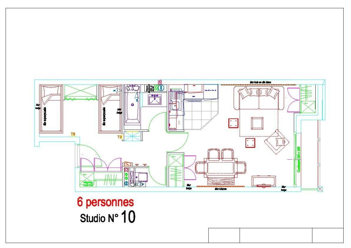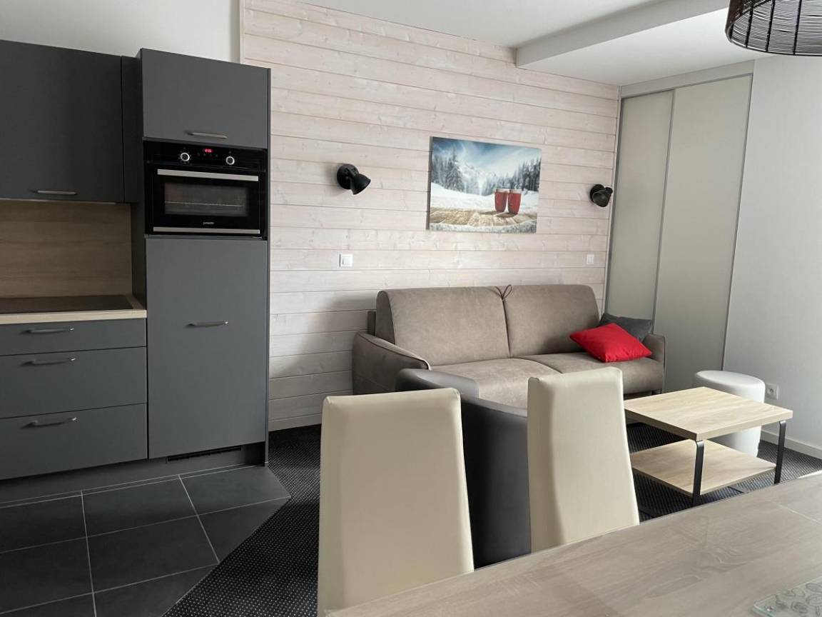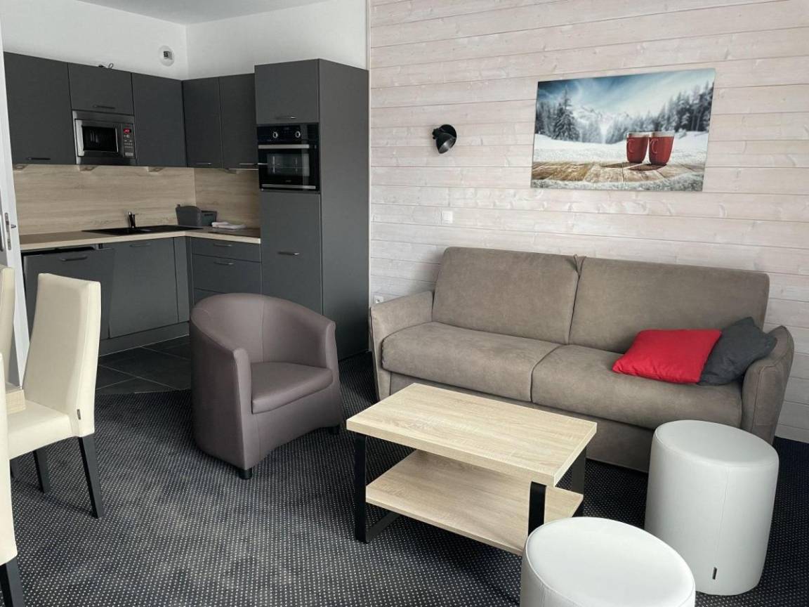 Fläche von ungefähr 42 m². 1te Etage. Orientierung : Süd. Blick berg und Station. Wohnzimmer mit Klappschlafcouch (160). offener Schlafbereich mit 4 Stockbetten (90). Küche mit Wasserkocher, Kaffeemaschine, Backofen, Toaster, Geschirrspülmaschine, Mikrowellenherd, 4 Herdplatten, Kühlschrank. Badezimmer mit Badewanne, Haartrockner. WC. Balkon. Die oberen Betten sind nicht für Kinder unter 6 Jahren geeignet.