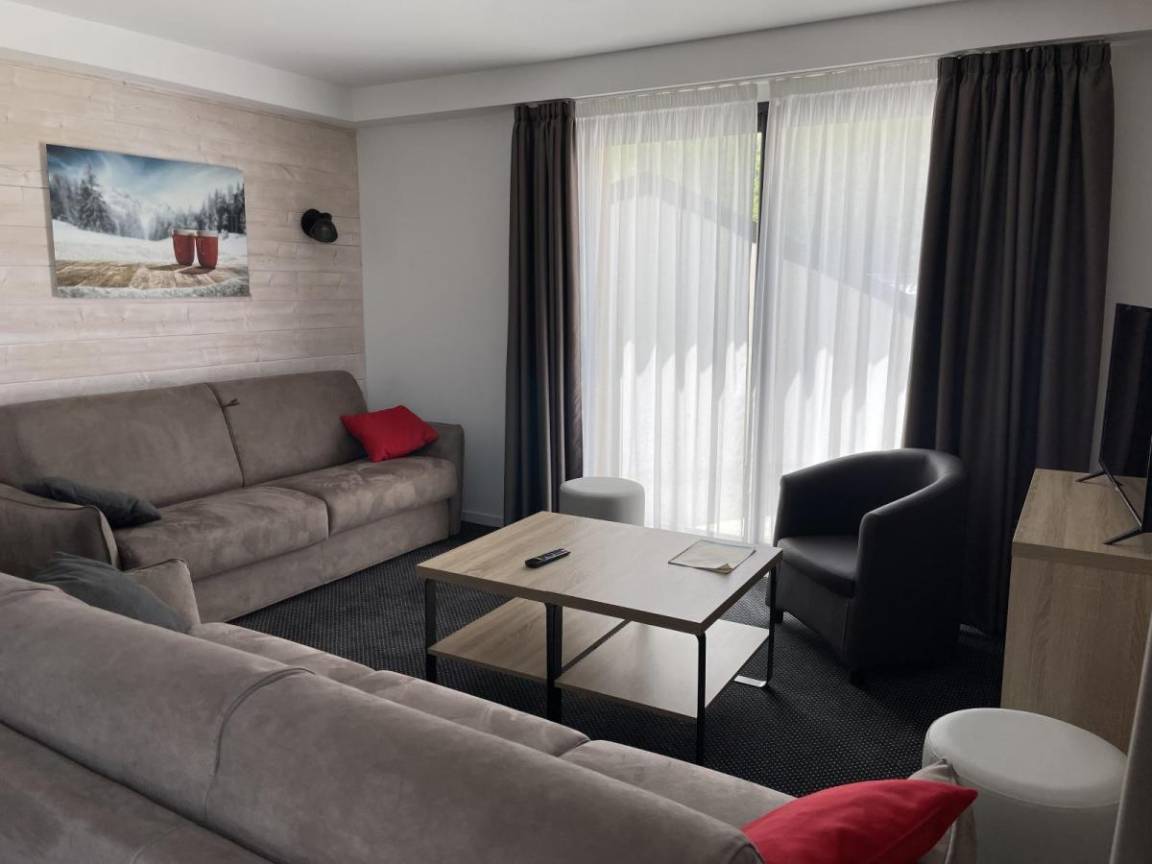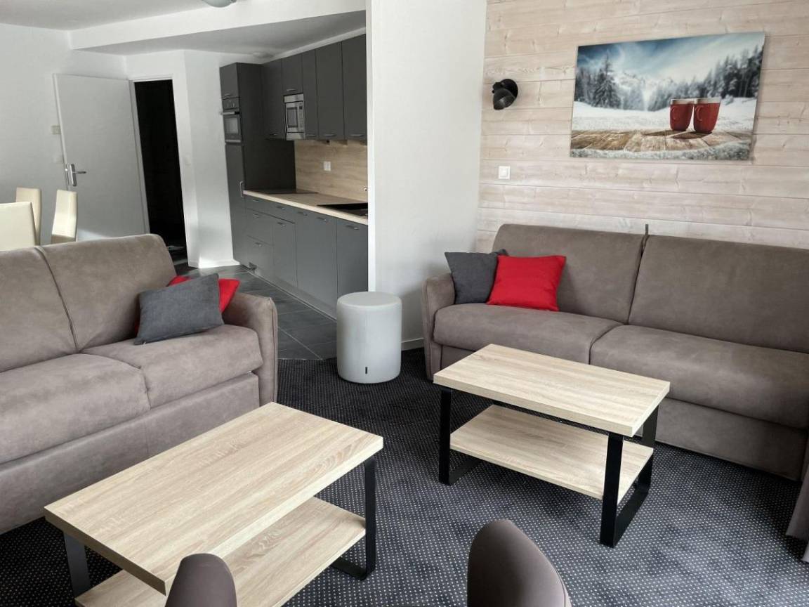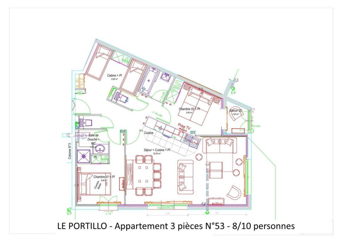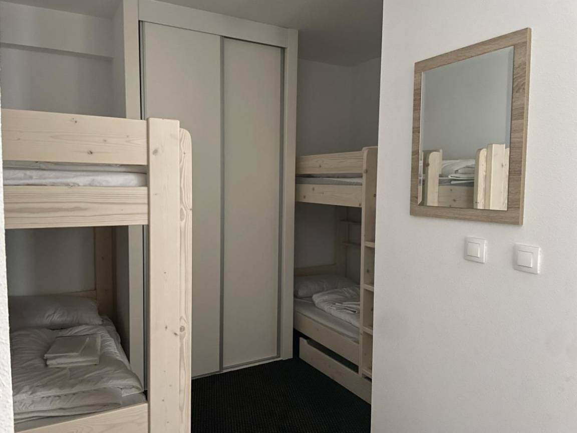 Fläche von ungefähr 75 m². 5te Etage. Orientierung : Ost, Süd, West. Wohnzimmer mit Klappschlafcouch (160). Schlafzimmer mit Doppelbett (140). Schlafzimmer mit 2 Einzelbetten (80). offener Schlafbereich mit 4 Stockbetten (90). Kochnische mit Wasserkocher, Kaffeemaschine (filtres), Backofen, Toaster, Geschirrspülmaschine, Mikrowellenherd, 4 Glaskeramikkochfelder, Kühlschrank. Waschräume mit WC. Badezimmer. 2 separate WCs. Balkon. Die oberen Betten sind nicht für Kinder unter 6 Jahren geeignet.