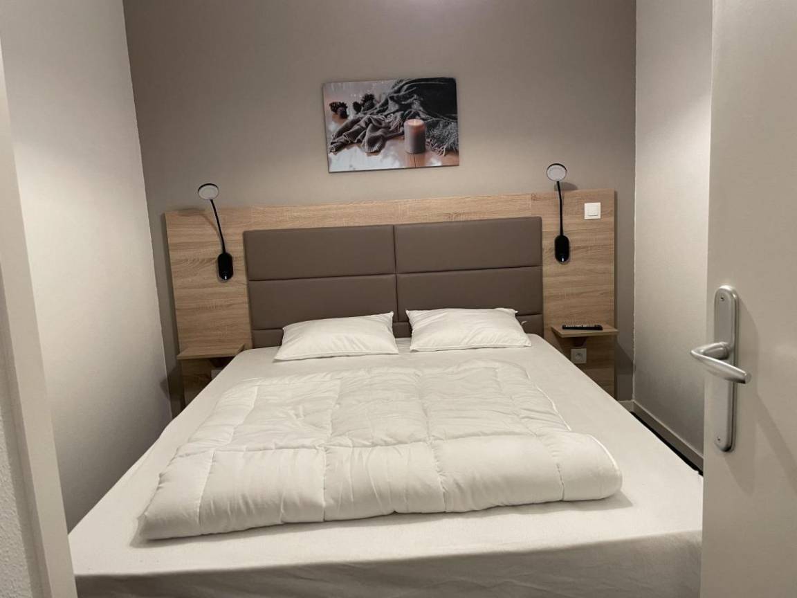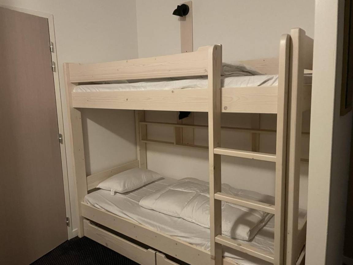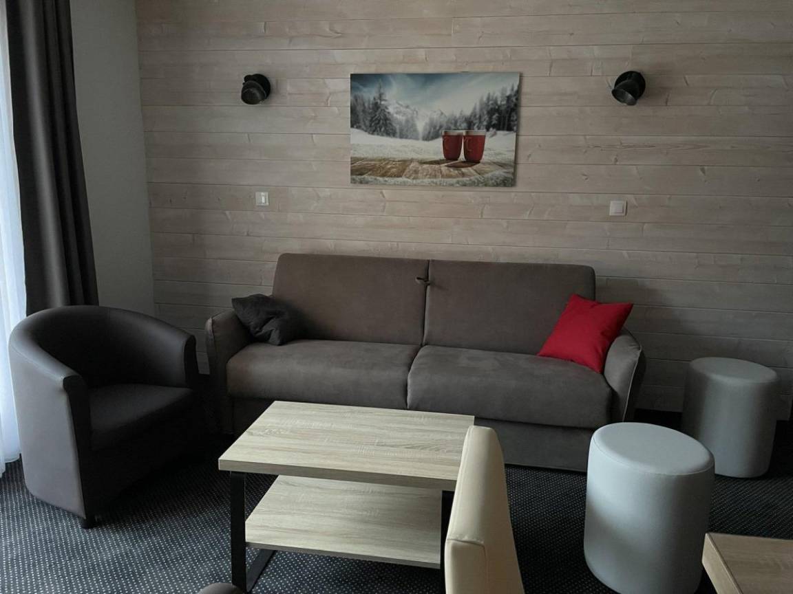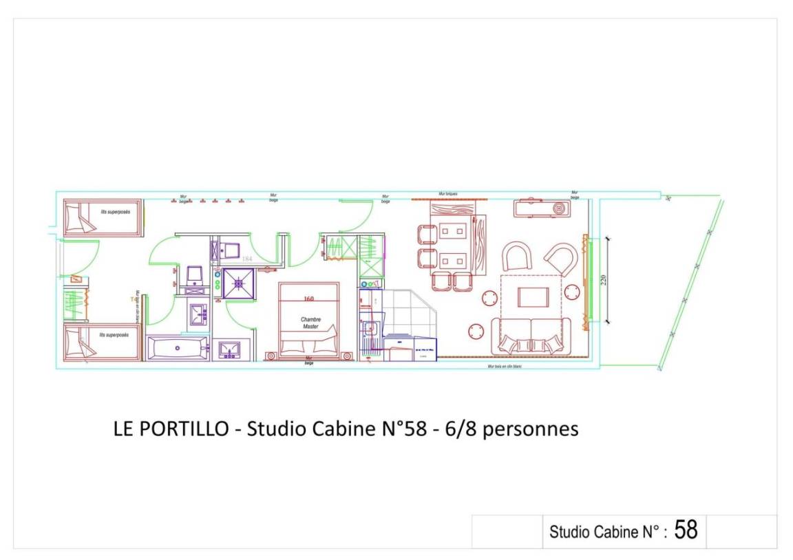 Fläche von ungefähr 58 m². 5te Etage. Orientierung : Süd. Blick berg und Tal. Wohnzimmer mit Klappschlafcouch (160). offener Schlafbereich mit 4 Stockbetten (90). offener Schlafbereich mit Doppelbett (160). Küche mit Wasserkocher, Kaffeemaschine, Backofen, Toaster, Geschirrspülmaschine, Mikrowellenherd, 4 Herdplatten, Kühlschrank. Waschräume mit Dusche. 2 WCs. Badezimmer mit Badewanne, Haartrockner. Terrasse. Die oberen Betten sind nicht für Kinder unter 6 Jahren geeignet.