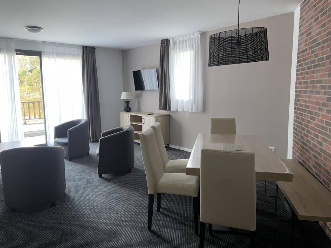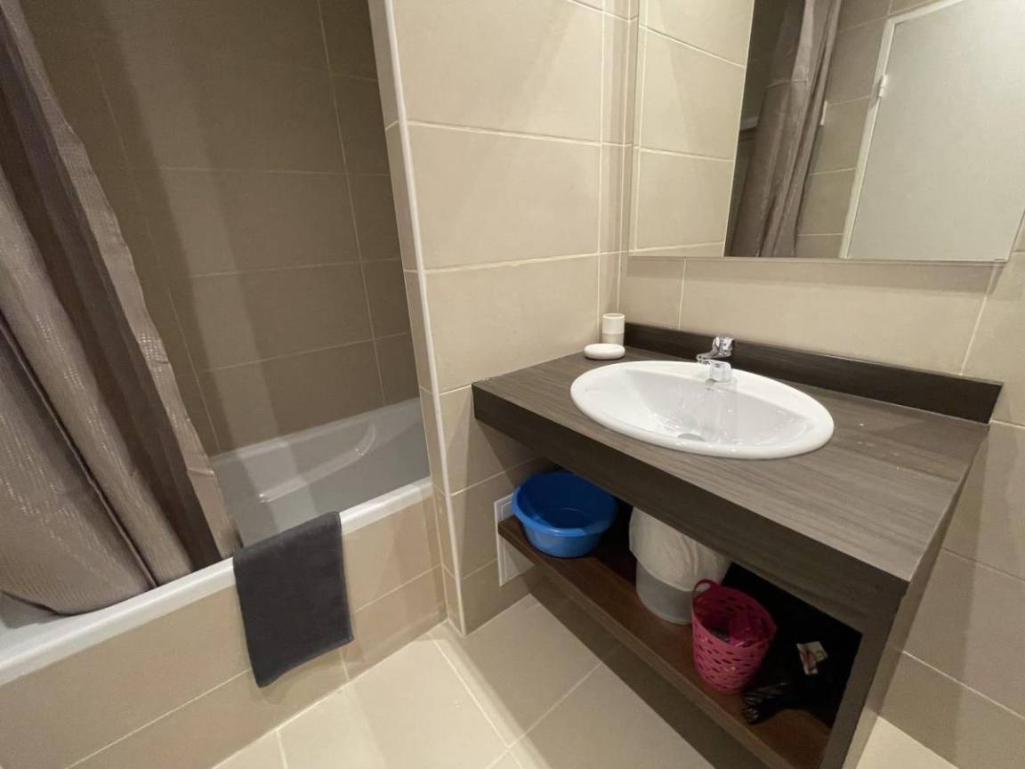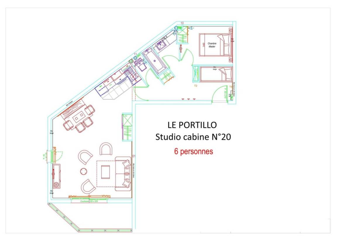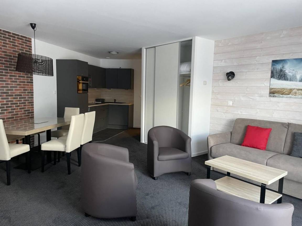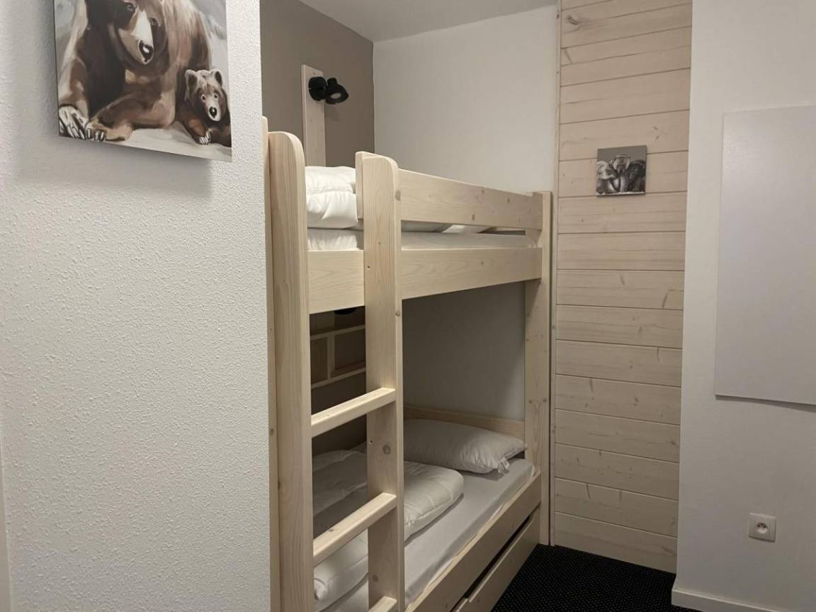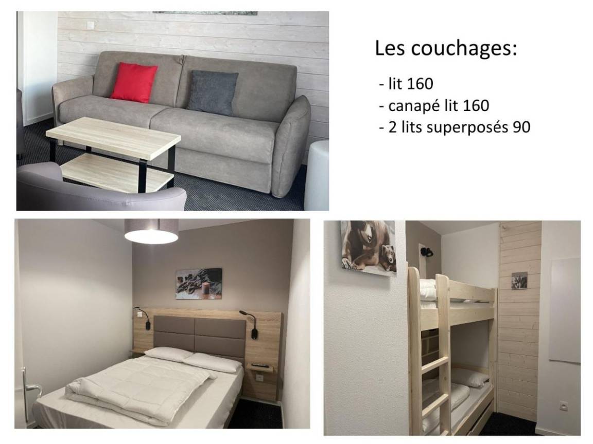 Fläche von ungefähr 56 m². 2te Etage. Orientierung : Süd. Blick skipisten und Station. Wohnzimmer mit Klappschlafcouch (160). offener Schlafbereich mit 2 Stockbetten (90). offener Schlafbereich mit Doppelbett (140). Küche mit Wasserkocher, Kaffeemaschine, Backofen, Toaster, Geschirrspülmaschine, Mikrowellenherd, 4 Herdplatten, Kühlschrank. Badezimmer mit Badewanne, Haartrockner. WC. Terrasse. Die oberen Betten sind nicht für Kinder unter 6 Jahren geeignet.