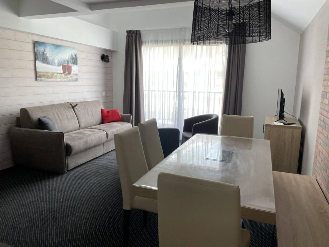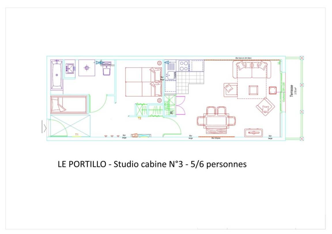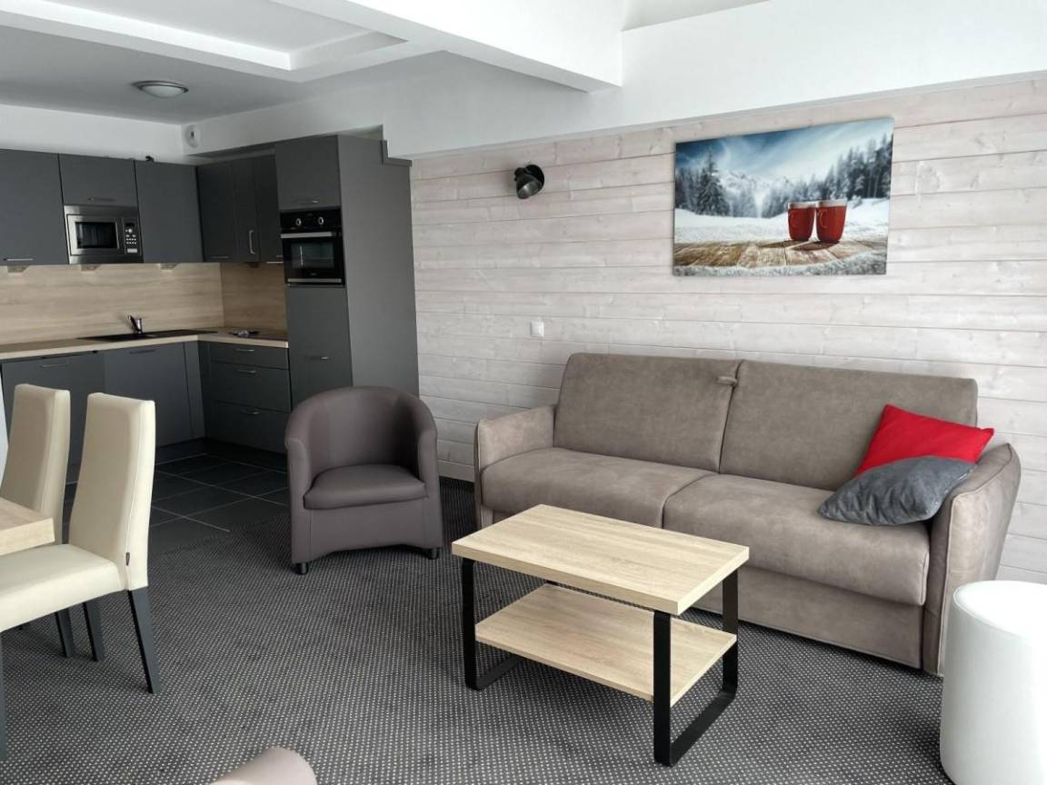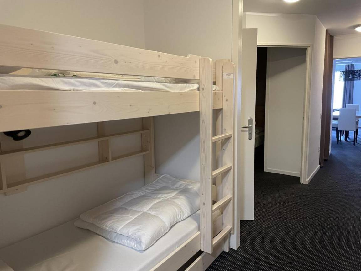 Fläche von ungefähr 52 m². Erdgeschoss. Orientierung : Süd, Süd-West. Blick skipisten und Station. Wohnzimmer mit Klappschlafcouch (160). offener Schlafbereich mit 2 Stockbetten (90). offener Schlafbereich mit 2 Einzelbetten (80). Küche mit Wasserkocher, Kaffeemaschine, Backofen, Toaster, Geschirrspülmaschine, Mikrowellenherd, 4 Herdplatten, Kühlschrank. Badezimmer mit Badewanne, Haartrockner, WC. Balkon. Die oberen Betten sind nicht für Kinder unter 6 Jahren geeignet.