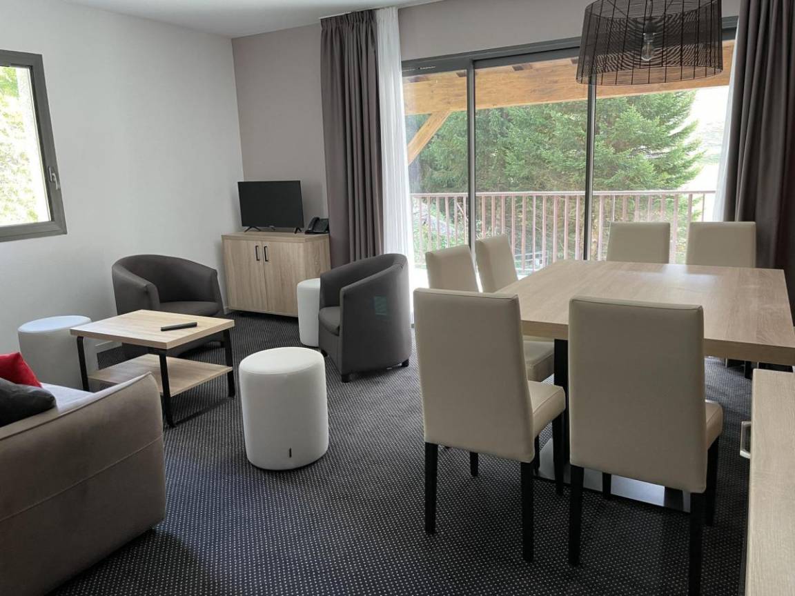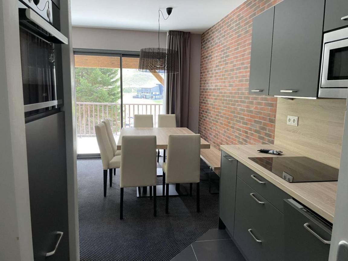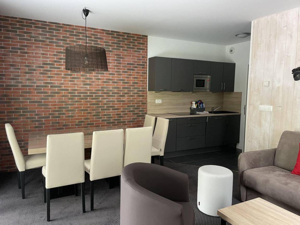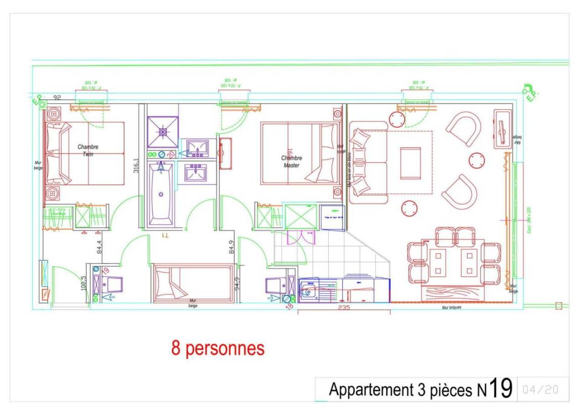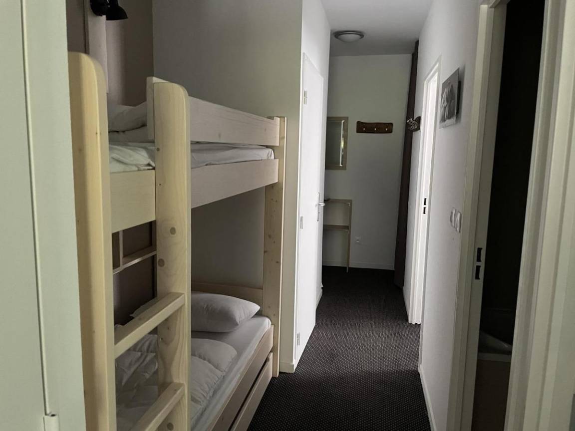 Fläche von ungefähr 61 m². 1te Etage. Orientierung : Süd, West. Wohnzimmer mit Klappschlafcouch (160). Schlafzimmer mit Doppelbett (160), . Schlafzimmer mit 2 Einzelbetten (80). offener Schlafbereich mit 2 Stockbetten (90). Kochnische mit Kaffeemaschine (filtres), Backofen, Toaster, Geschirrspülmaschine, Mikrowellenherd, 4 Glaskeramikkochfelder, Kühl-Gefrier-Kombination. Badezimmer. 2 separate WCs. Terrasse. Die oberen Betten sind nicht für Kinder unter 6 Jahren geeignet.