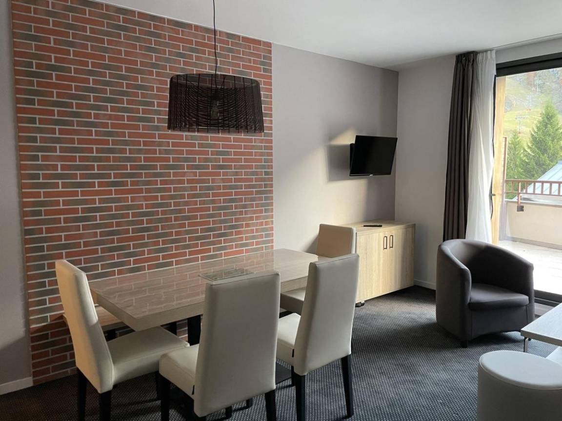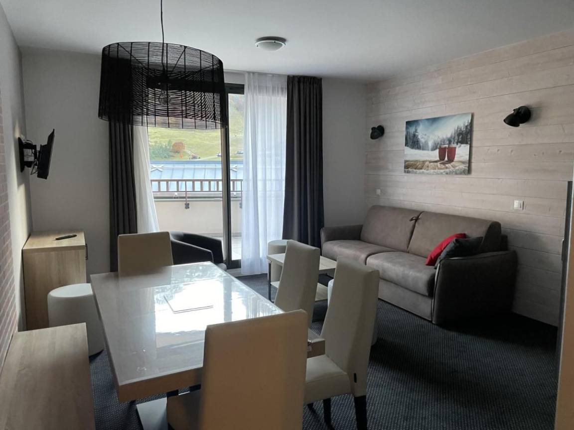 Fläche von ungefähr 50 m². 5te Etage. Orientierung : Süd. Blick skipisten. Wohnzimmer mit Klappschlafcouch (160), TV. offener Schlafbereich mit 3 Stockbetten (90). Schlafzimmer mit Doppelbett (160), , TV, WC. Küche mit Kaffeemaschine (filtre), Backofen, Toaster, Geschirrspülmaschine, Mikrowellenherd, 2 Glaskeramikkochfelder, Kühlschrank, . Badezimmer. WC. Terrasse. Die oberen Betten sind nicht für Kinder unter 6 Jahren geeignet.