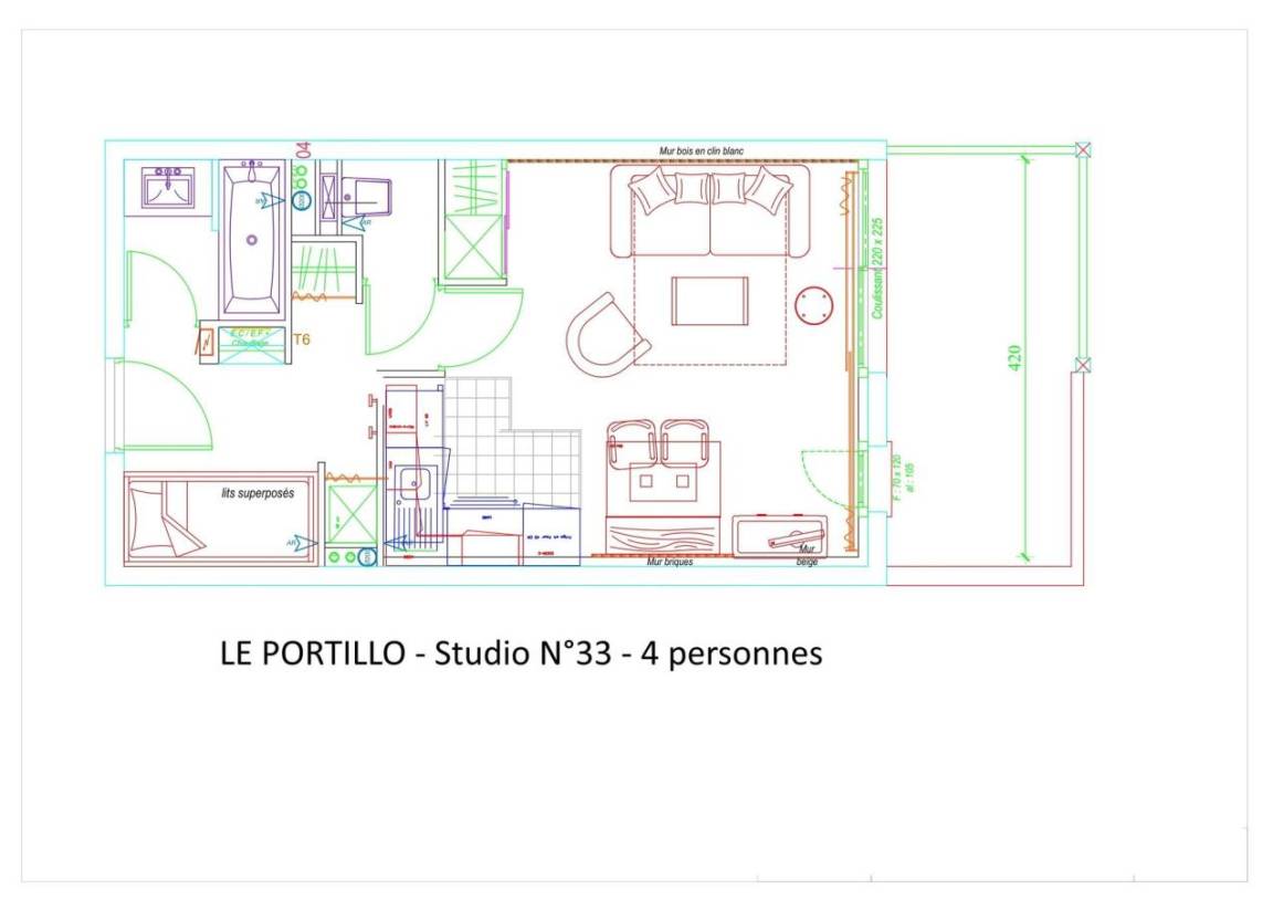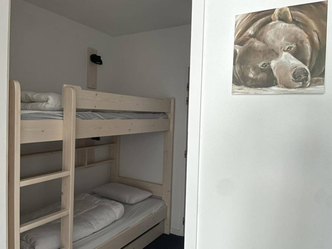 Fläche von ungefähr 32 m². 3te Etage. Orientierung : Süd. Blick skipisten und Station. Wohnzimmer mit Klappschlafcouch (160). offener Schlafbereich mit 2 Stockbetten (90). Küche mit Wasserkocher, Kaffeemaschine, Backofen, Toaster, Geschirrspülmaschine, Mikrowellenherd, 4 Herdplatten, Kühlschrank. Badezimmer mit Badewanne, Haartrockner. WC. Terrasse. Die oberen Betten sind nicht für Kinder unter 6 Jahren geeignet.