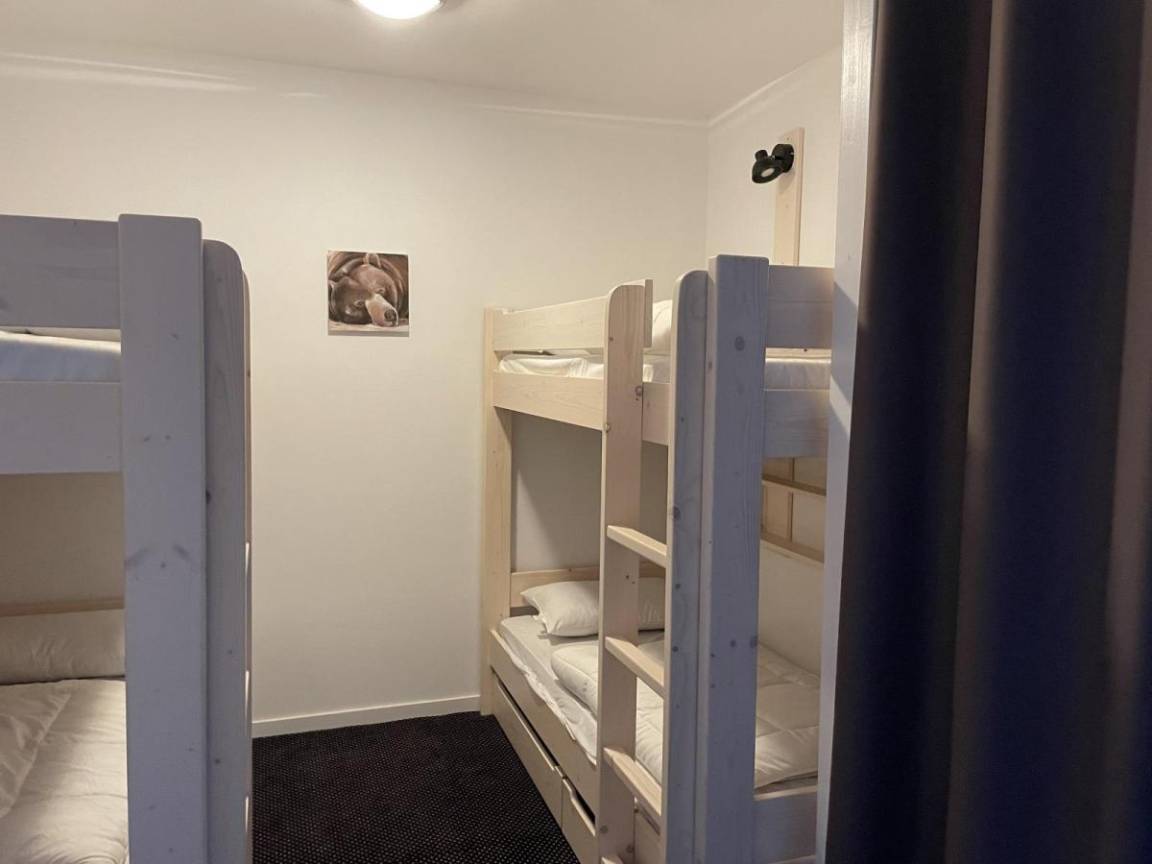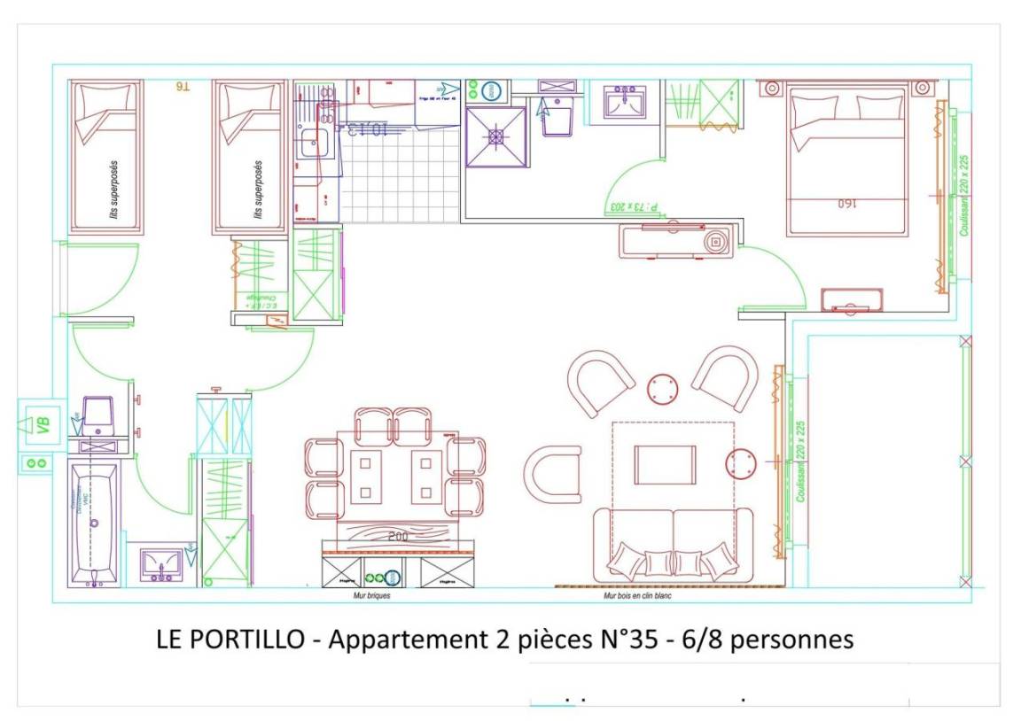 Fläche von ungefähr 66 m². 3te Etage. Orientierung : Süd, West. Wohnzimmer mit Klappschlafcouch (160). Schlafzimmer mit Doppelbett (160), , WC. offener Schlafbereich mit 4 Stockbetten (90). Kochnische mit Kaffeemaschine (filtres), Backofen, Toaster, Geschirrspülmaschine, Mikrowellenherd, 4 Glaskeramikkochfelder, Kühl-Gefrier-Kombination. Badezimmer. separates WC. Die oberen Betten sind nicht für Kinder unter 6 Jahren geeignet.