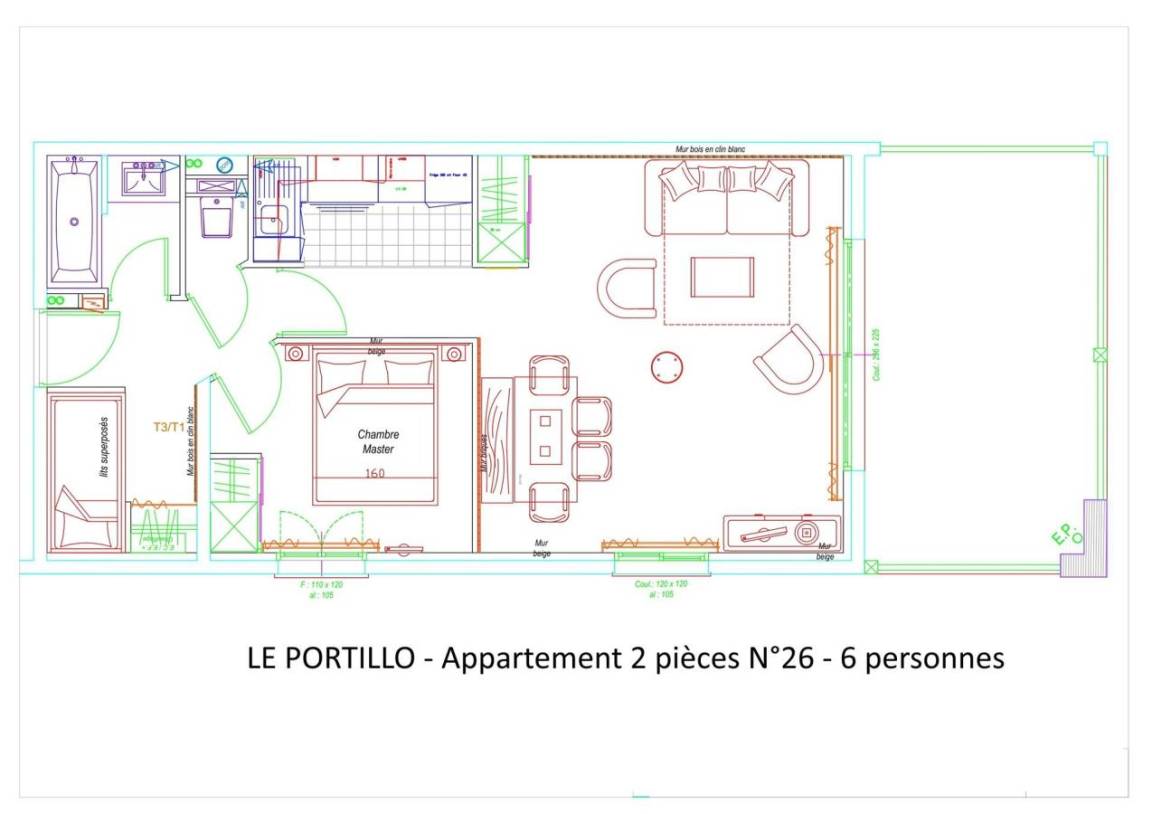 Fläche von ungefähr 49 m². 2te Etage. Orientierung : Süd, Süd-West. Blick berg und Skipisten. Wohnzimmer mit Klappschlafcouch, TV. offener Schlafbereich mit 2 Stockbetten. Schlafzimmer mit Doppelbett. Küche mit Wasserkocher, Kaffeemaschine, Backofen, Toaster, Geschirrspülmaschine, Mikrowellenherd, 4 Herdplatten, Kühlschrank. Badezimmer mit Badewanne, Haartrockner. separates WC. Terrasse. Die oberen Betten sind nicht für Kinder unter 6 Jahren geeignet.