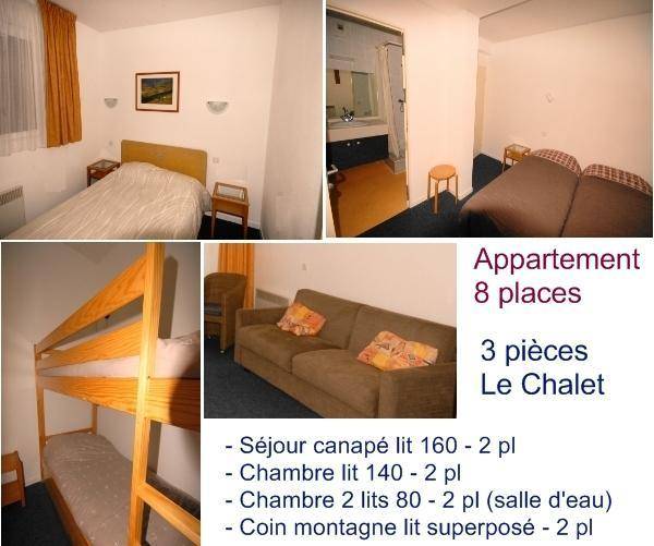 Fläche von ungefähr 62 m². 1te Etage. Orientierung : Süd. Blick skipisten. Wohnzimmer ab 22.00 m² mit Klappschlafcouch (160). Schlafzimmer ab 7.00 m² mit Doppelbett (140). Schlafzimmer ab 14.00 m² mit 2 Einzelbetten, Waschraum, WC. Alkoven ab 4.00 m² mit 2 Stockbetten. Küche mit Kaffeemaschine, Backofen, Toaster, Geschirrspülmaschine, Mikrowellenherd, Mixer, 4 Glaskeramikkochfelder, Kühlschrank. Badezimmer ab 3.00 m² mit Badewanne, Waschbecken, Haartrockner. separates WC. Die oberen Betten sind nicht für Kinder unter 6 Jahren geeignet.
