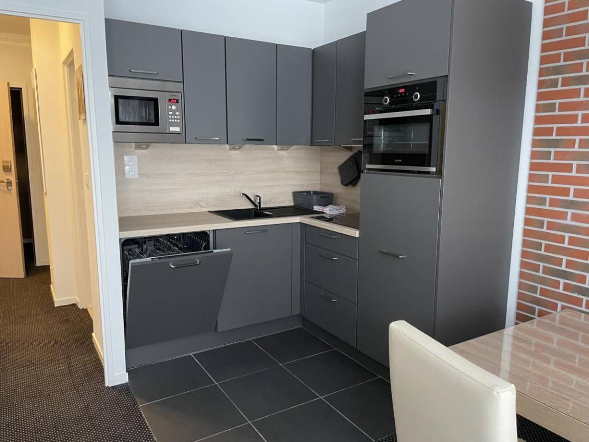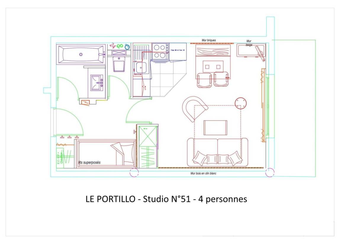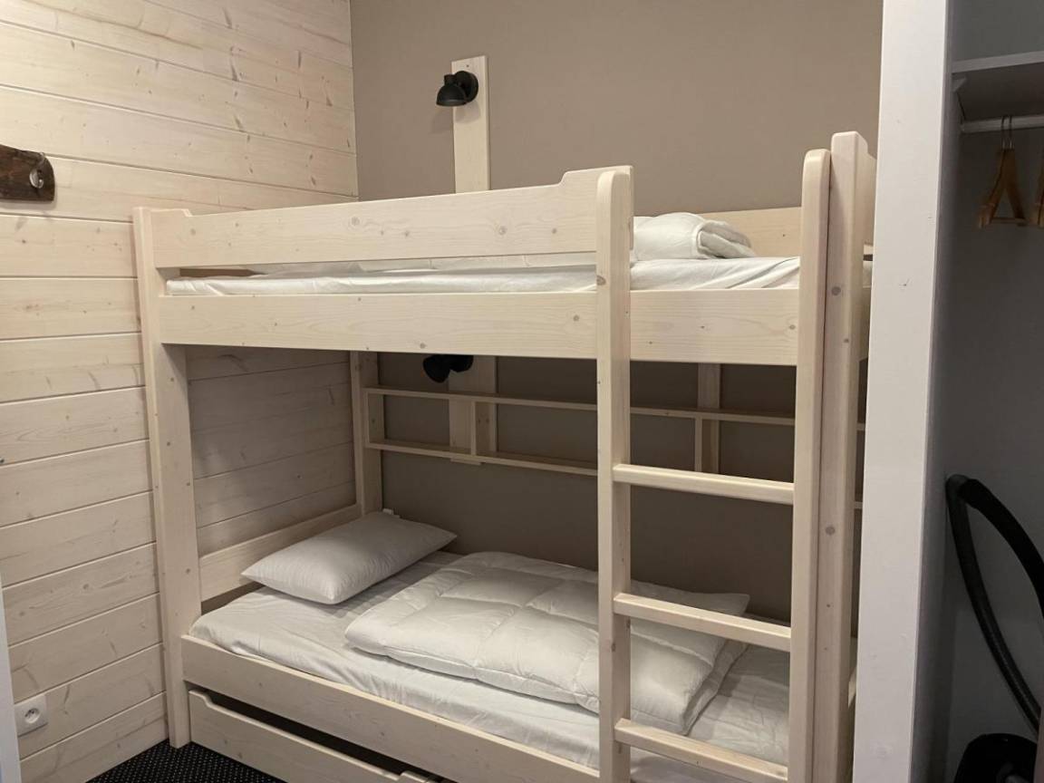 Fläche von ungefähr 29 m². 5te Etage. Orientierung : Süd, West. Wohnzimmer mit Klappschlafcouch (160). offener Schlafbereich mit 2 Stockbetten (90). Kochnische mit Wasserkocher, Kaffeemaschine (filtres), Backofen, Toaster, Geschirrspülmaschine, Mikrowellenherd, 4 Glaskeramikkochfelder, Kühl-Gefrier-Kombination. Badezimmer. separates WC. Terrasse. Die oberen Betten sind nicht für Kinder unter 6 Jahren geeignet.