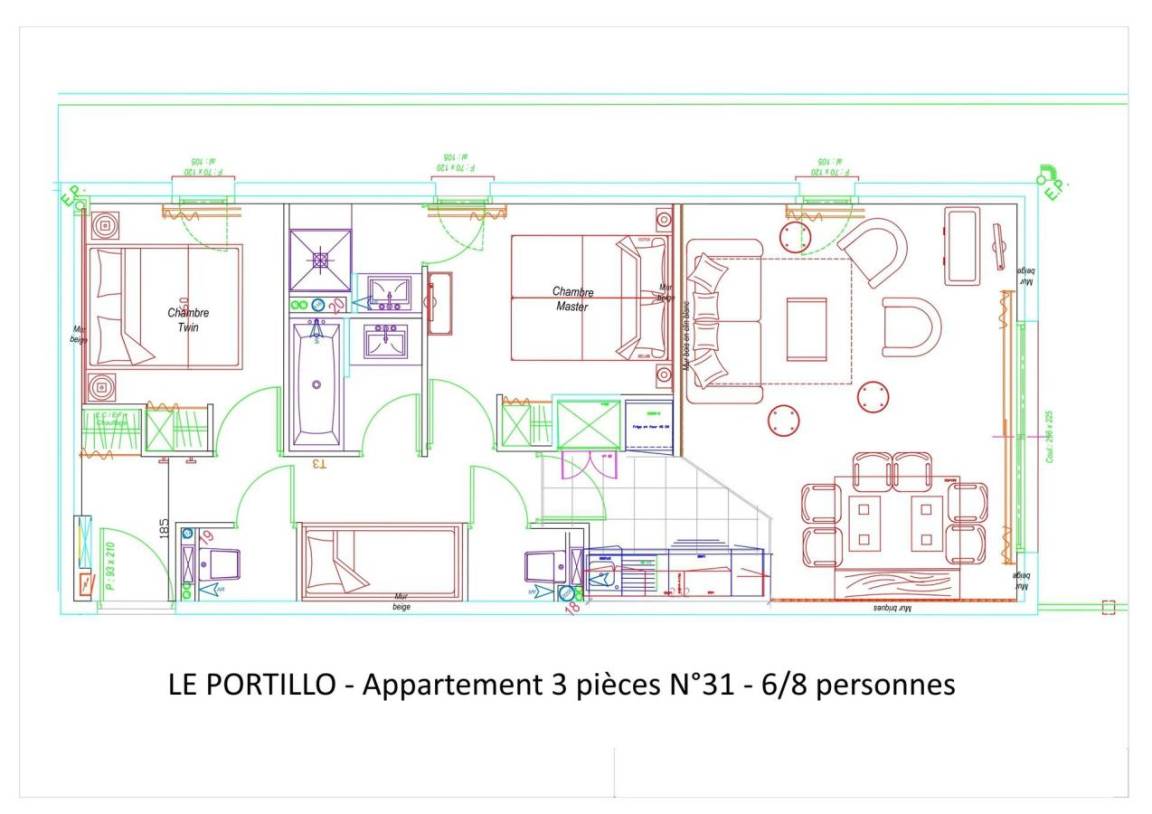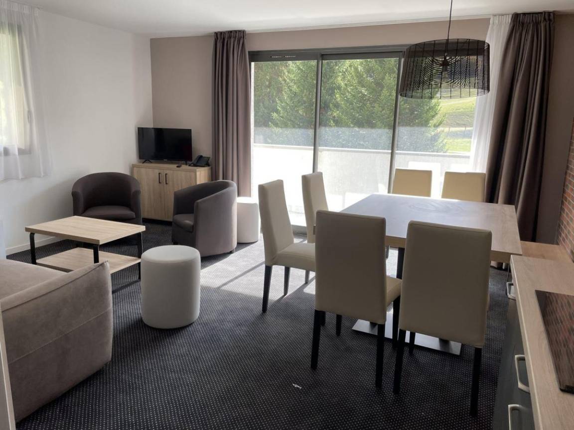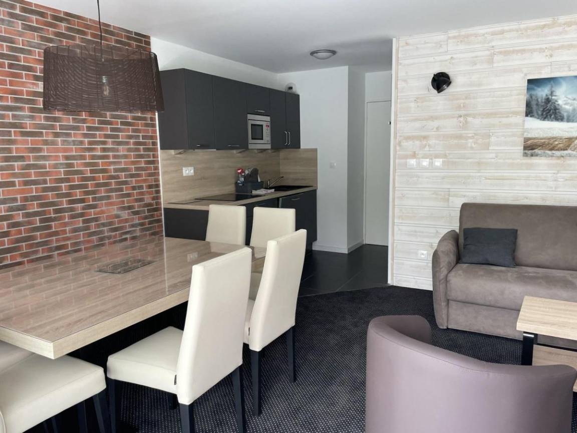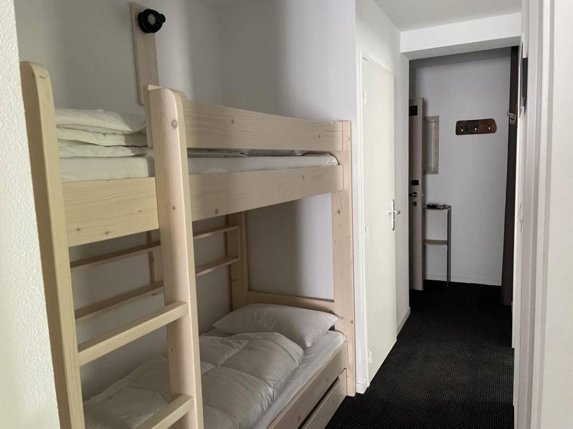 Fläche von ungefähr 61 m². 2te Etage. Orientierung : Süd-Ost, Süd. Blick skipisten. Wohnzimmer mit Klappschlafcouch (160). Schlafzimmer mit Doppelbett (160). Schlafzimmer mit 2 zwei Einzelbetten (80), . offener Schlafbereich mit 2 Stockbetten (80). Kochnische mit Wasserkocher, Kaffeemaschine (filtres), Backofen, kleiner Backofen mit Mikrowellenfunktion, Toaster, Geschirrspülmaschine, 2 Glaskeramikkochfelder, Kühlschrank. Badezimmer. 2 separate WCs. Balkon. Die oberen Betten sind nicht für Kinder unter 6 Jahren geeignet.
