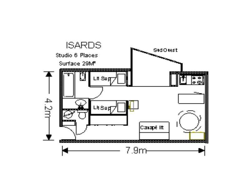 Fläche von ungefähr 29 m². 4te Etage. Orientierung : Süd. Blick skipisten. Wohnzimmer ab 18.00 m² mit Klappschlafcouch. offener Schlafbereich ab 5.00 m² mit 4 Stockbetten. Küche mit Kaffeemaschine, Backofen, Toaster, Geschirrspülmaschine, Mikrowellenherd, 4 Glaskeramikkochfelder, Kühlschrank. Badezimmer ab 3.00 m² mit Badewanne, Waschbecken. separates WC. Balkon. Die oberen Betten sind nicht für Kinder unter 6 Jahren geeignet.