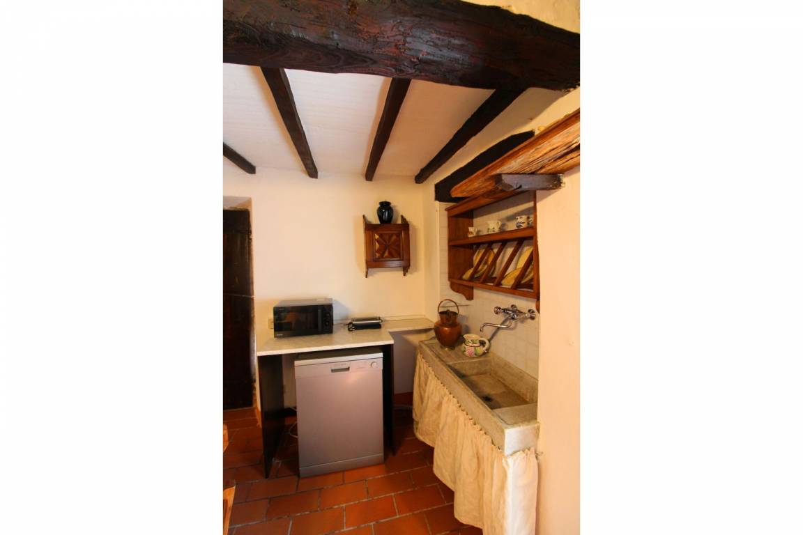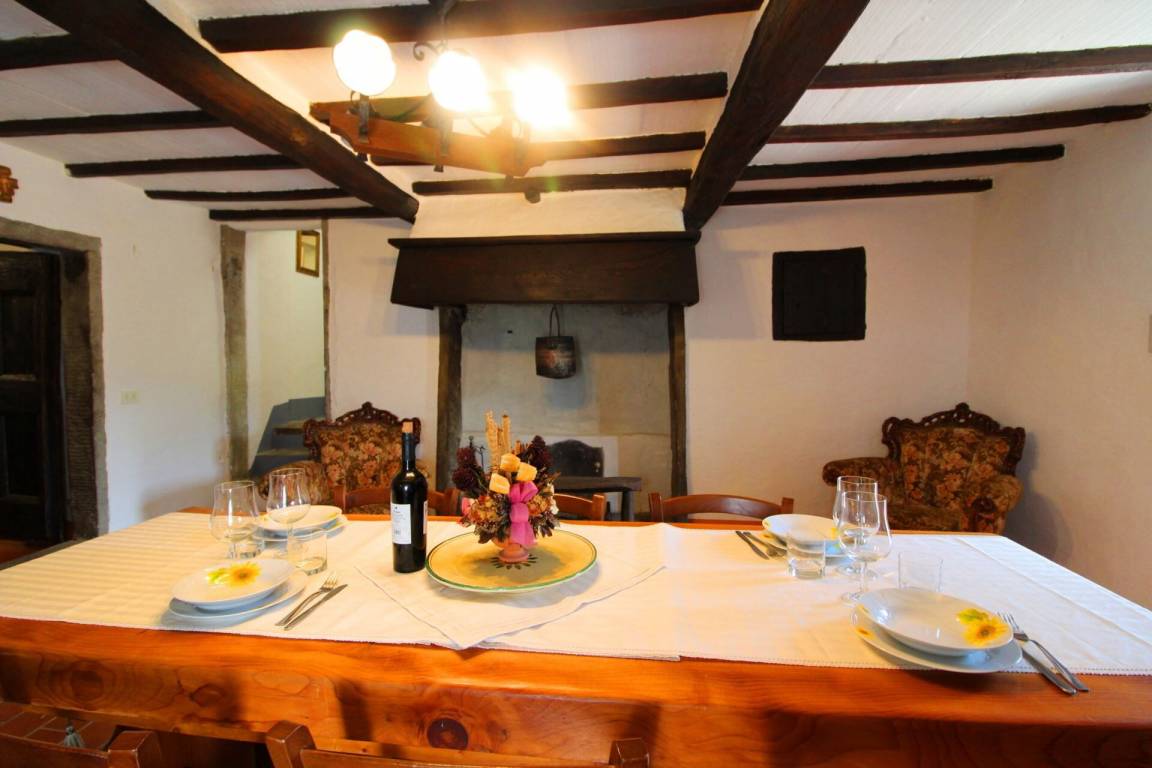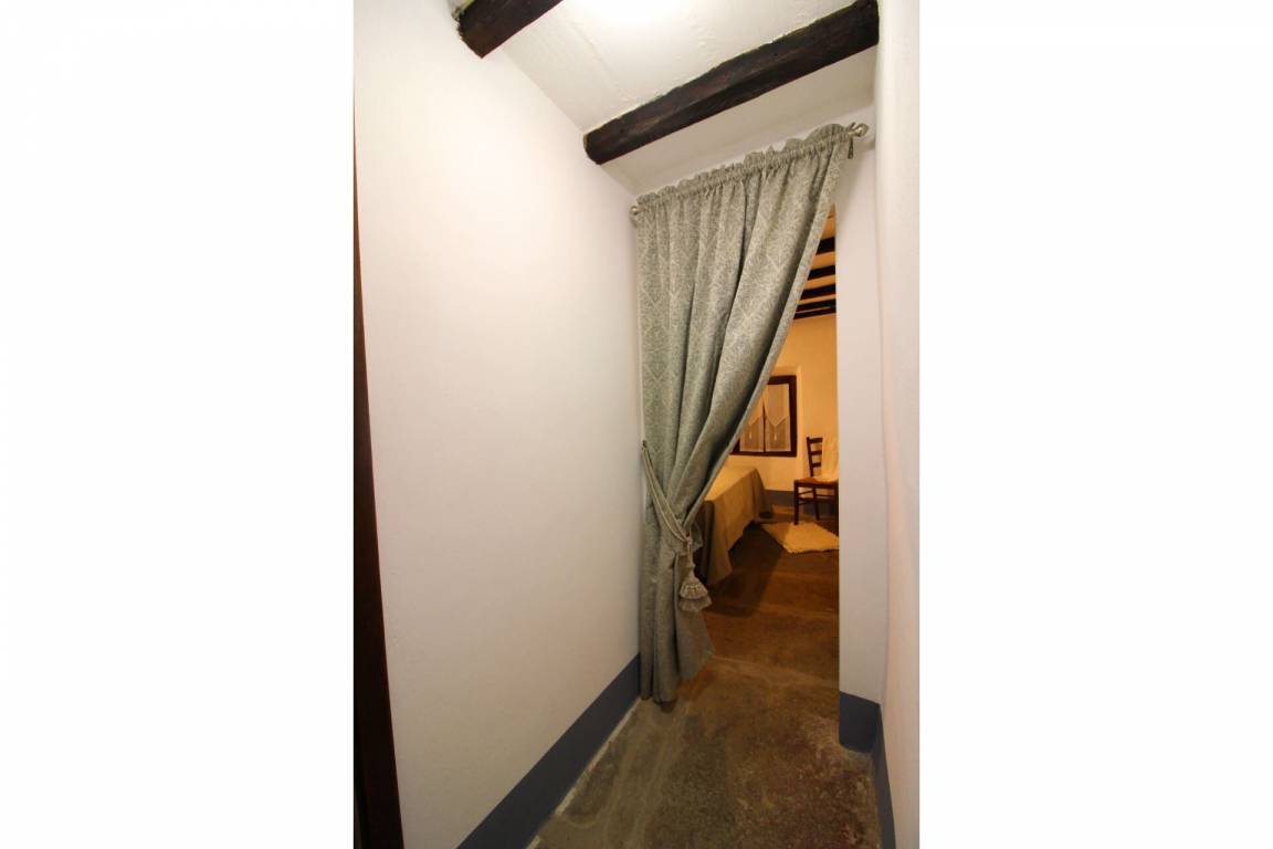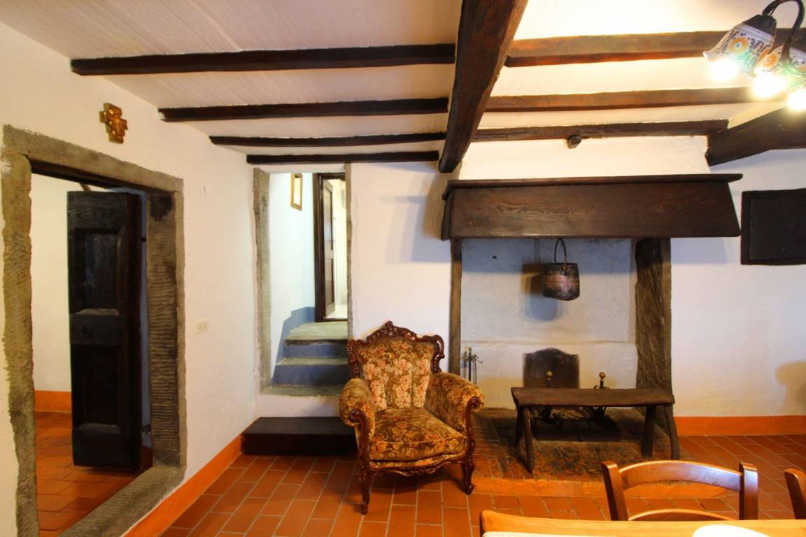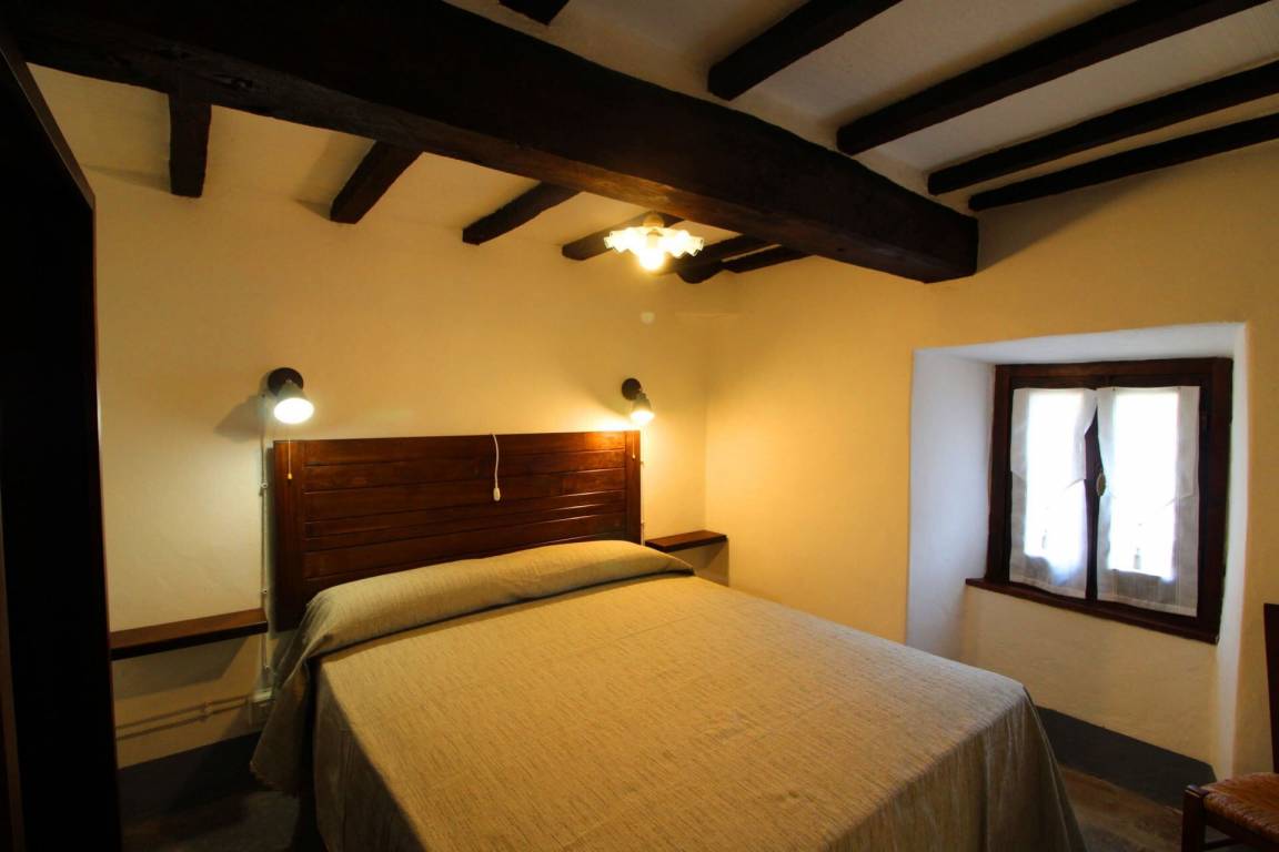 ERSTER STOCK: über eine Außentreppe mit Panoramaterrasse erreichbar, Eingang zum großen Wohn-Esszimmer mit Küchenecke und altem Kamin. Ein paar Stufen führen zu zwei Doppelschlafzimmern und einem Bad mit Dusche. Es besteht die Möglichkeit, in einem der Schlafzimmer im ersten Stock ein Einzelbett aufzustellen.