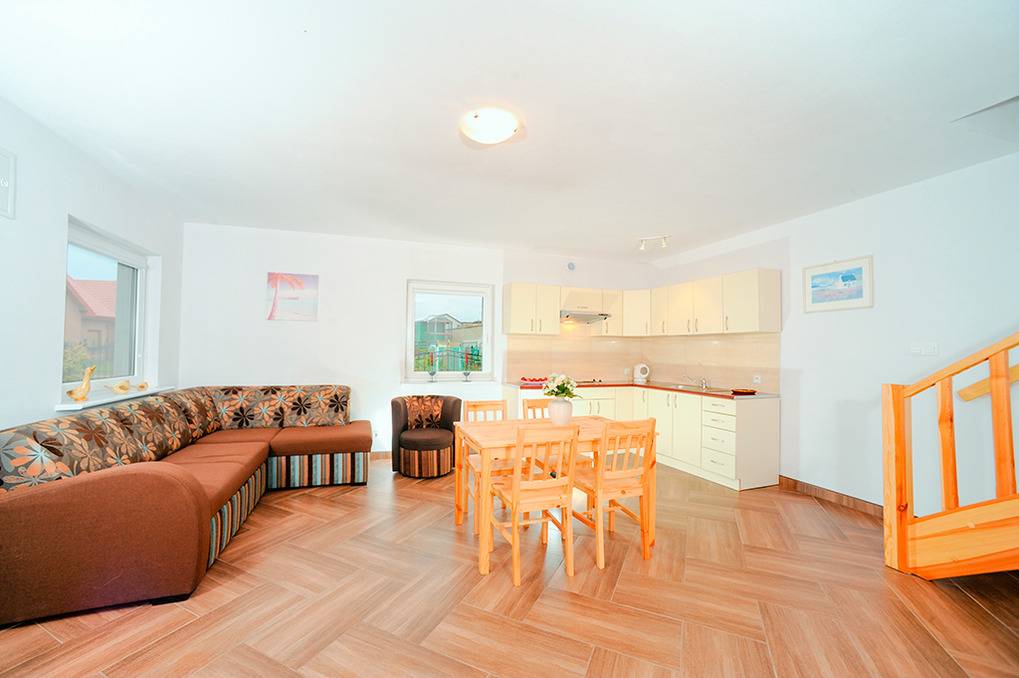 PL 80.8A-W Ferienhaus 2-6 Pers.: 3-Zimmerhaushälfte mit ca. 40 qm Wohnfläche über 2 Etagen. Parterre: Wohn-/Essraum mit Couchgarnitur (Ausziehsofa 2 Pers.), Flachbild Sat-TV, Esstisch, Küchenzeile (2 E-Platten, Abzughaube). Bad/WC. Dachgeschoss mit Schrägen: Doppelzimmer. 2-Bettzimmer. Separates WC. Terrasse mit Sitzmöbeln.