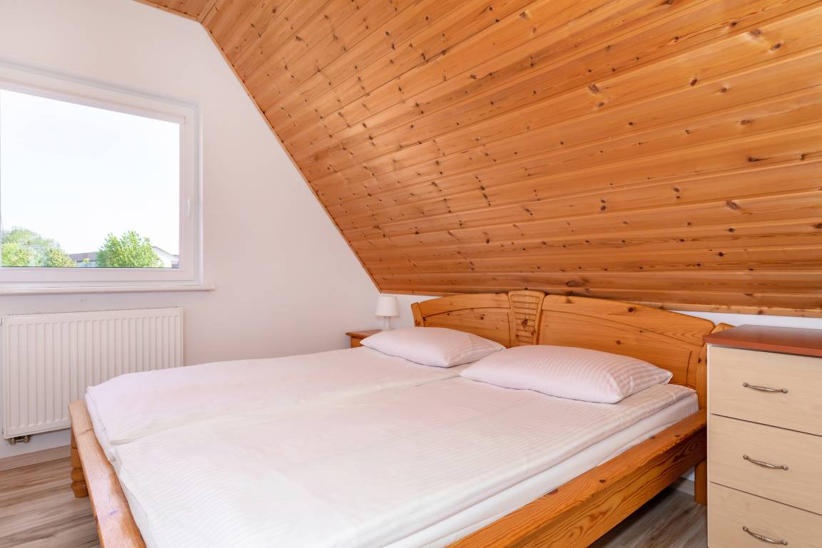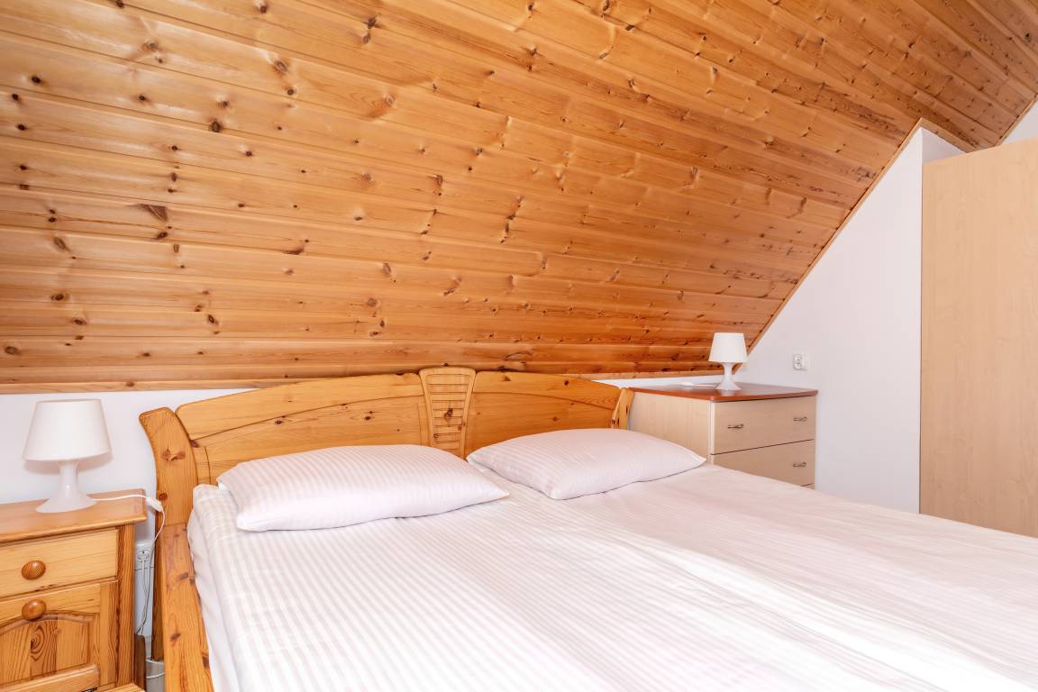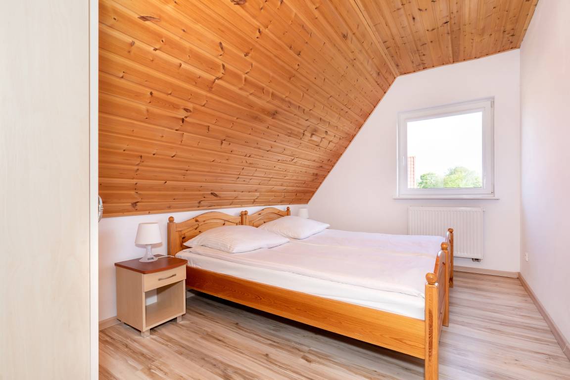 PL 80.9 Ferienhaus 2-6 Pers.: 3-Zimmerhaushälfte mit ca. 44 qm Wohnfläche über 2 Etagen. Parterre: Wohn-/Essraum mit Kamin, Couchgarnitur (Ausziehsofa 2 Pers.), Flachbild Sat-TV, Esstisch, Küchenzeile (2 E-Platten, Abzugshaube). Bad/WC. Dachgeschoss mit Schrägen: Doppelzimmer. 2-Bettzimmer. Separates WC.