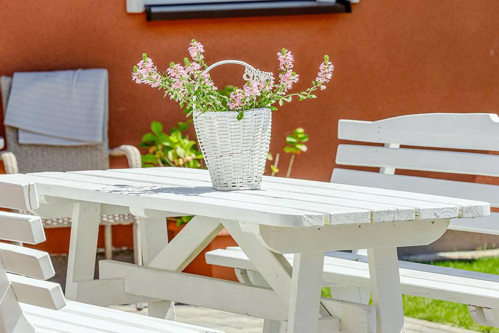 Haus: Ferienhaus mit 2 Haushälften auf einem großen Grundstück. Nichtraucherhäuser. Wohnliche, freundliche Einrichtung. Kostenloses Internet. Zentralheizung. Vor dem Haus große Terrasse mit Sitzmöbeln und Rasenfläche mit Liegen, Grill.