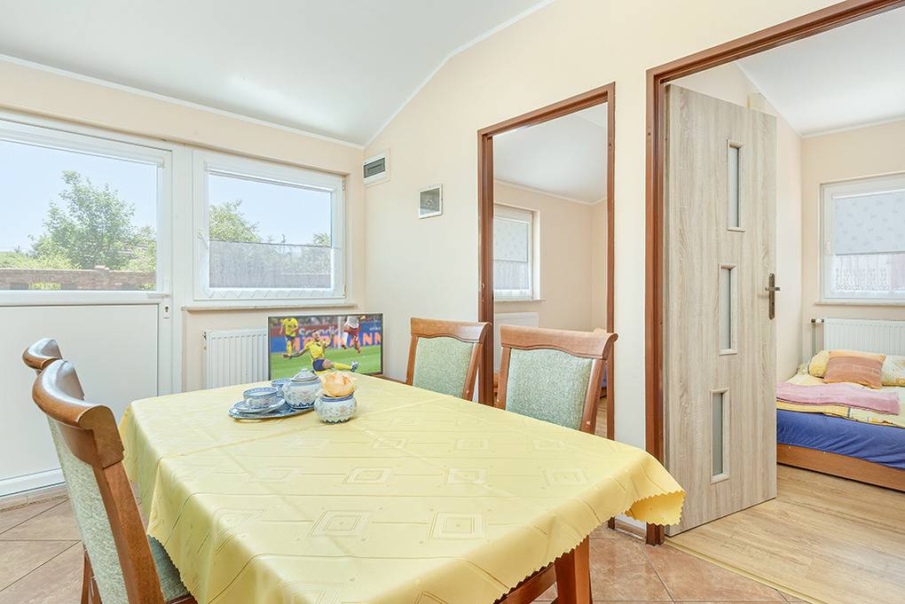 PL 80.12 Ferienhaus 1-6 Pers.: Gemütliche 3-Zimmerhaushälfte mit ca. 50 qm Wohnfläche. Wohn-/Essraum mit Sofa (Schlafcouch 2 Pers.), Flachbild Sat-TV, Esstisch, Küchenzeile (2 Gas-Platten, Kühlschrank). Bad: Dusche, Wb, WC. Zwei 2-Bettzimmer.Terrasse mit Sitzmöbeln.