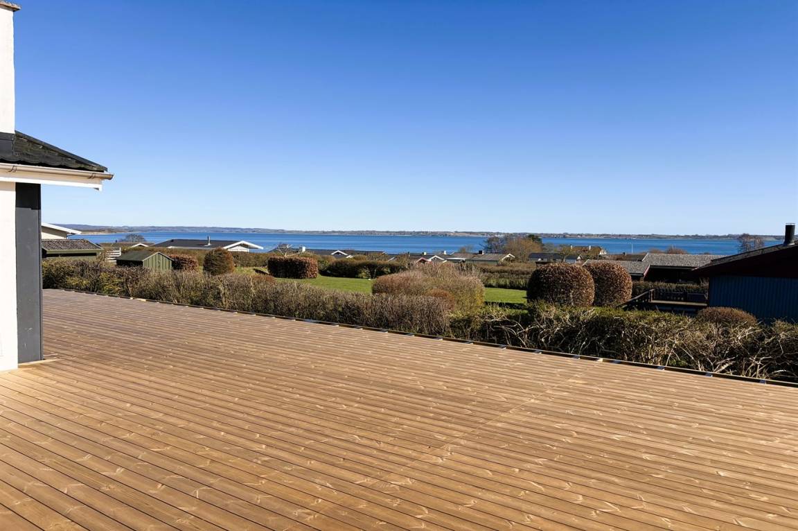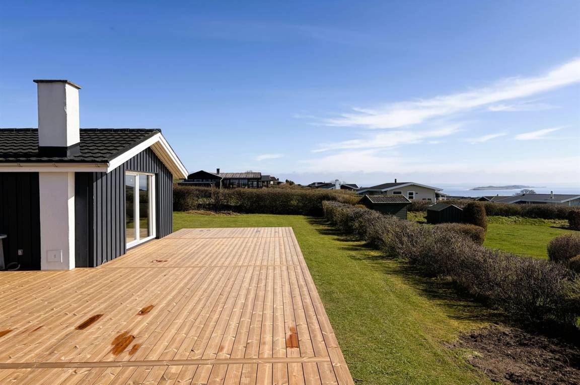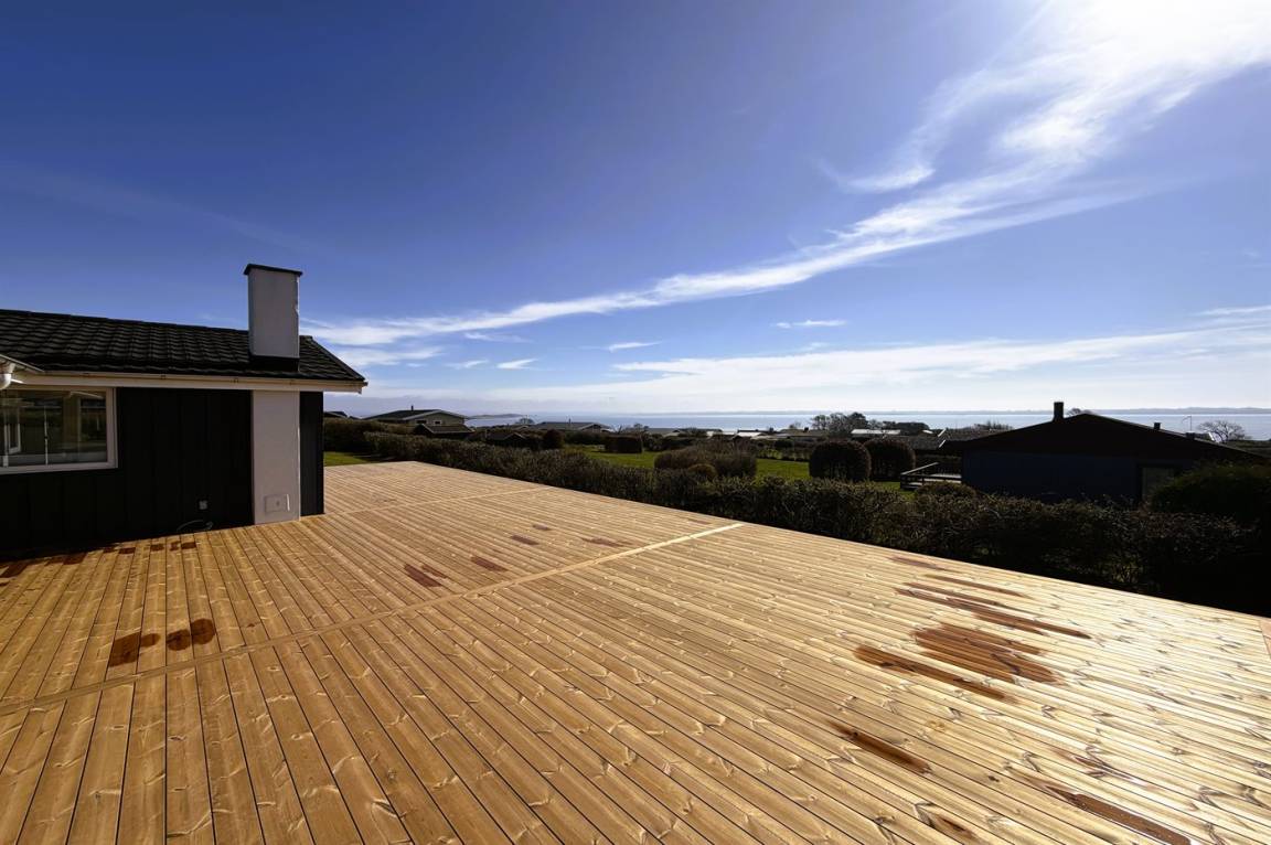 Schönes Ferienhaus mit einer fantastisch schönen Aussicht über das Wasser – sowohl vom Haus als auch von der großen Terrasse vor dem Haus.